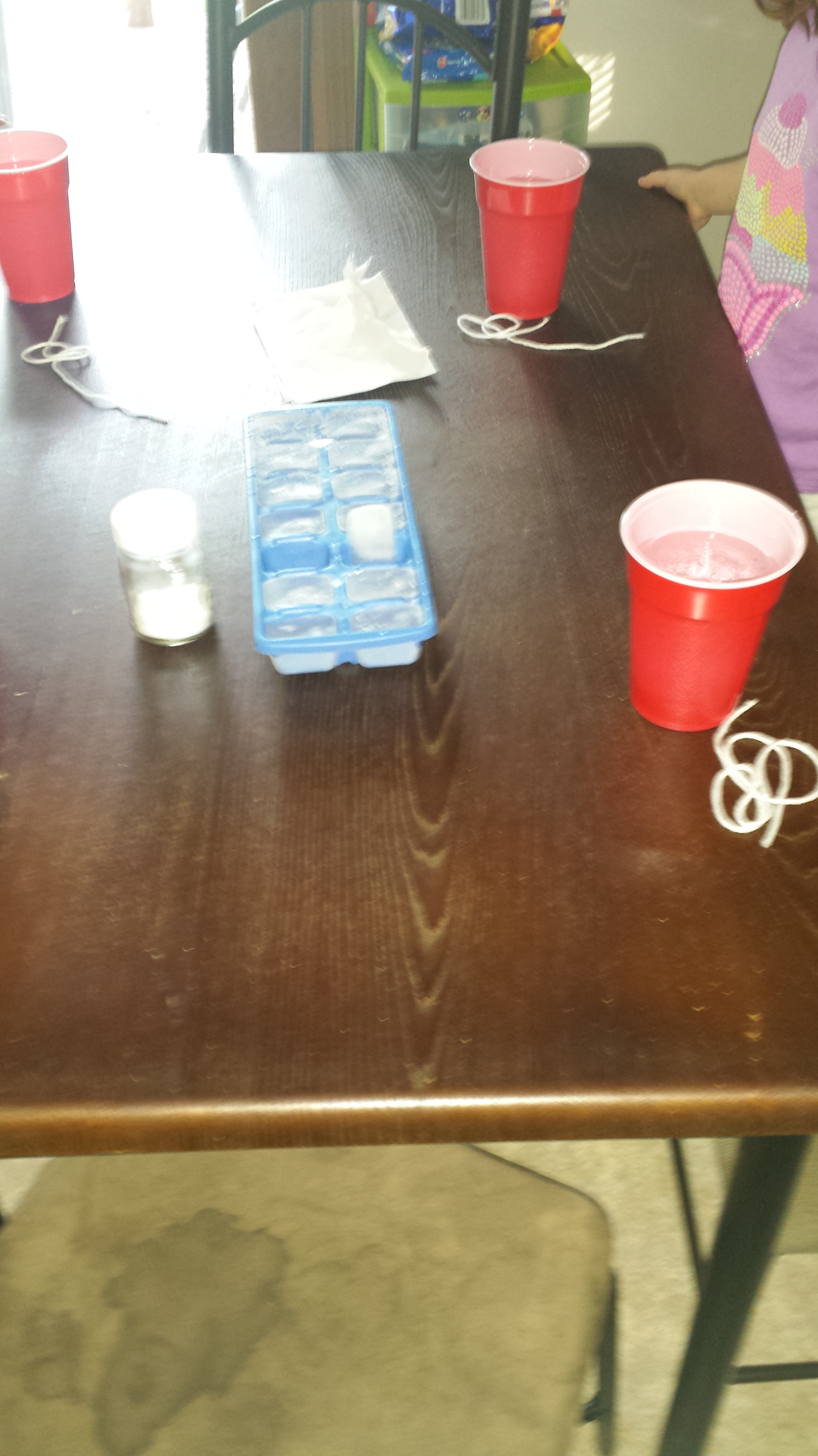 The kids then took their pieces of string and attempted to pick up the ice-cube with it. With each attempt they all failed. They were trying different maneuvers such as scooping it with the string and trying to fling it. Alas, they could not. So then I told them to use the salt. They each poured a little salt on their ice cubes and then they placed the string over top of the ice-cube. They were instructed to let the strings sit for a few minutes.