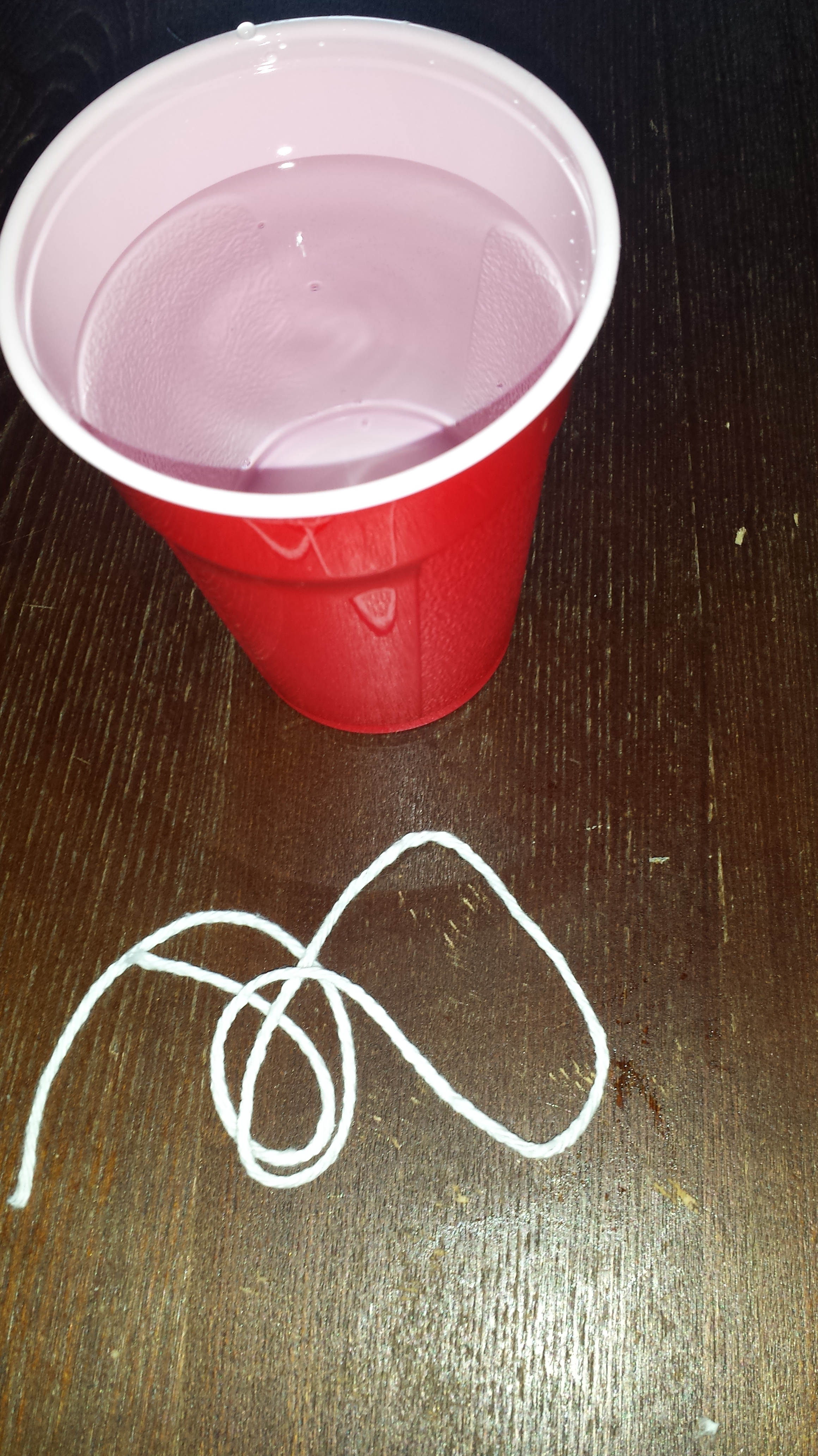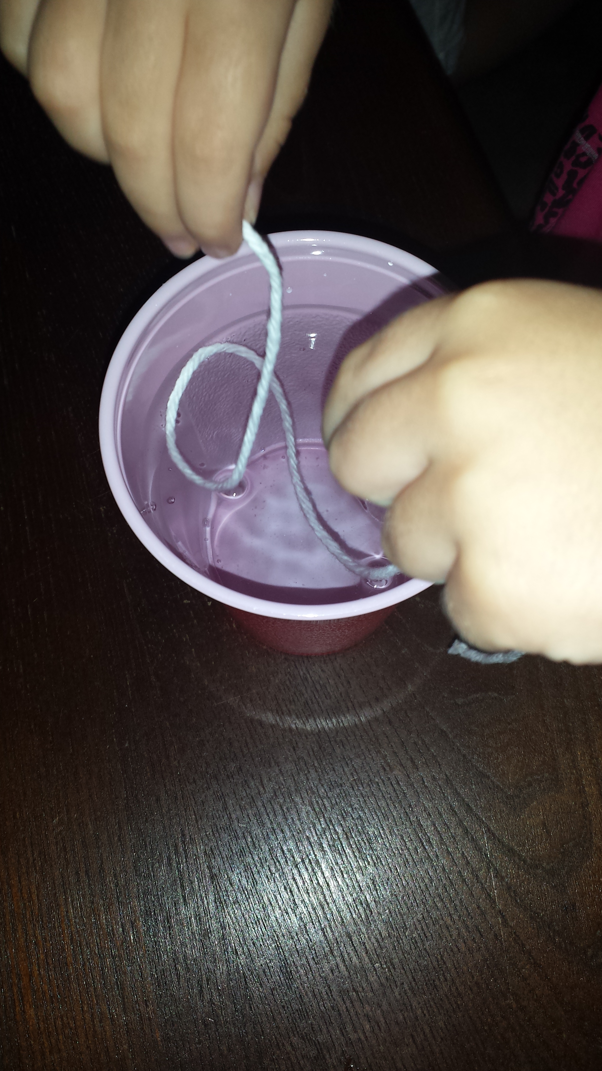 For the first one (Ice pick up aka Ice experiment) I took some old string I had and cut up small pieces for the kids to use to grab up the ice. I then took cups and filled them up with water. Each kid had their own cup. I then took ice cubes and dropped one in each cup.
