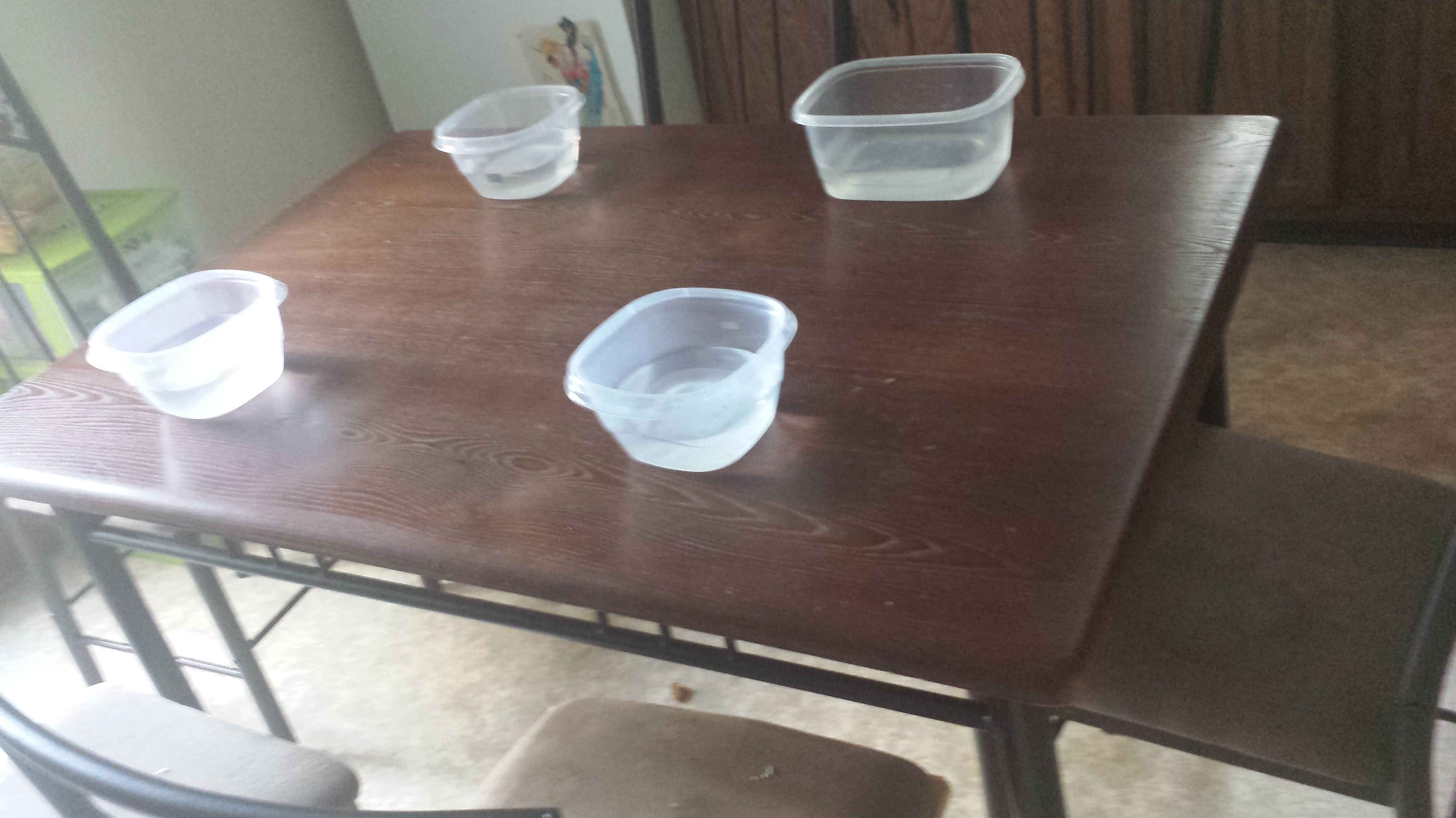 Recently we had decided to begin doing activities with the kids so this past Monday we started it. I have looked on, you guessed it, Pinterest, for ideas on what to do. The one we decided to go with first was Rain clouds. You can find the original post here. I took four small containers and filled them up about half way with water.