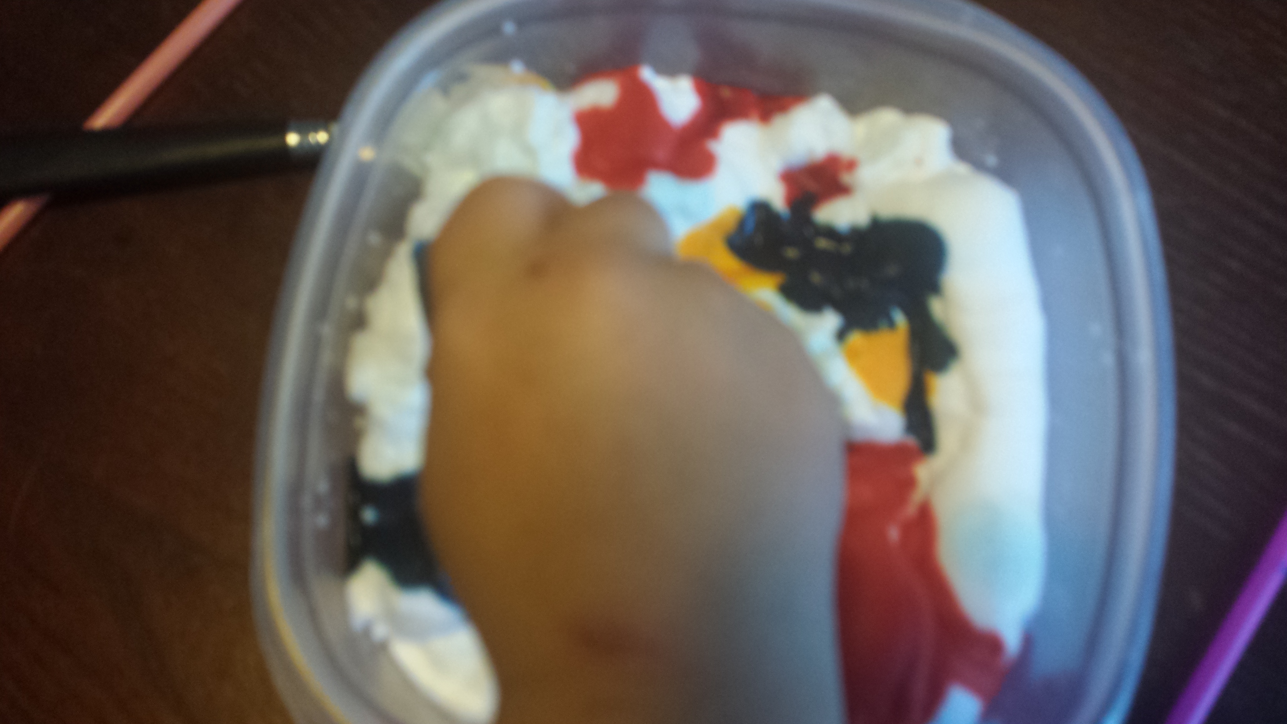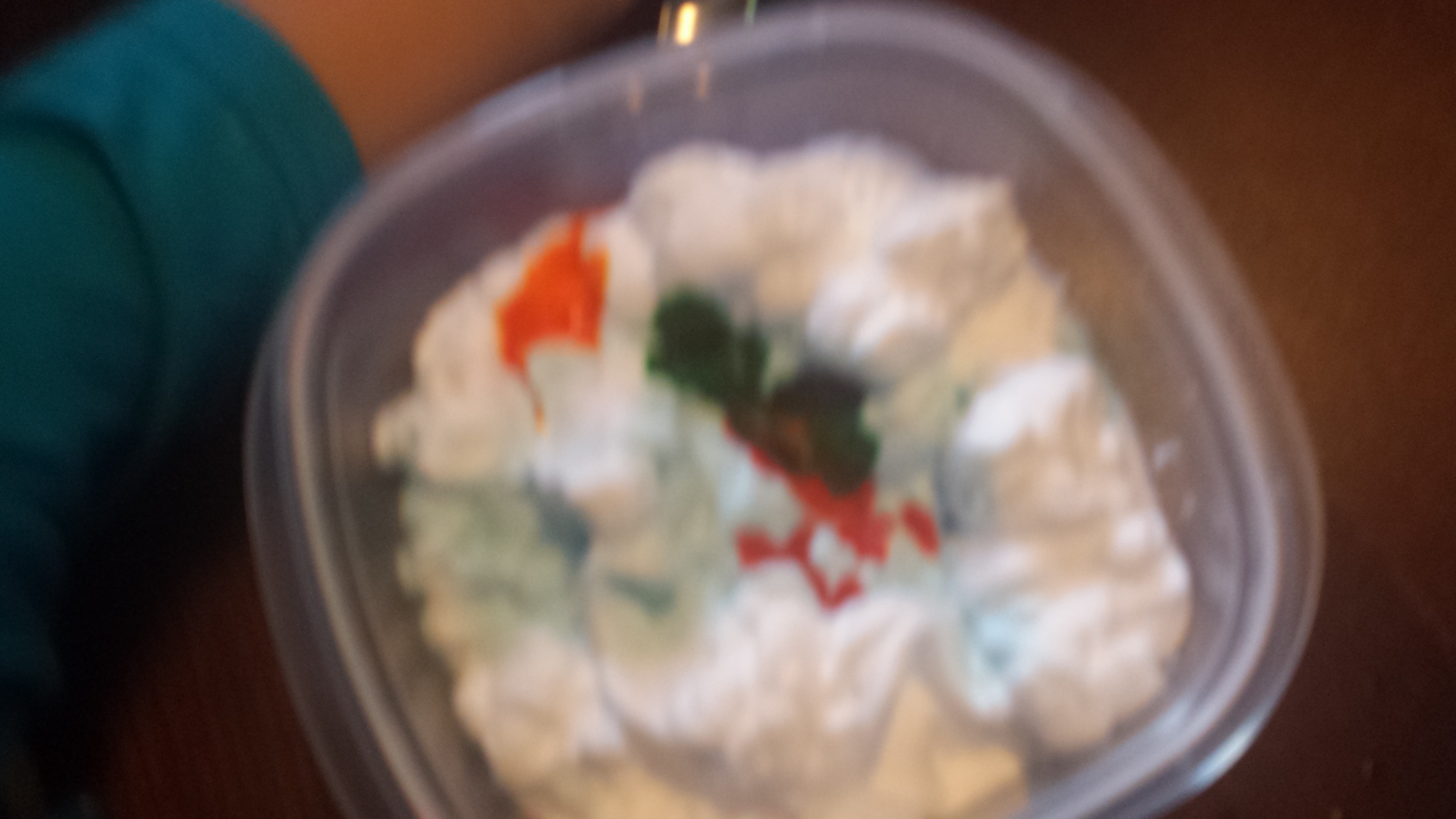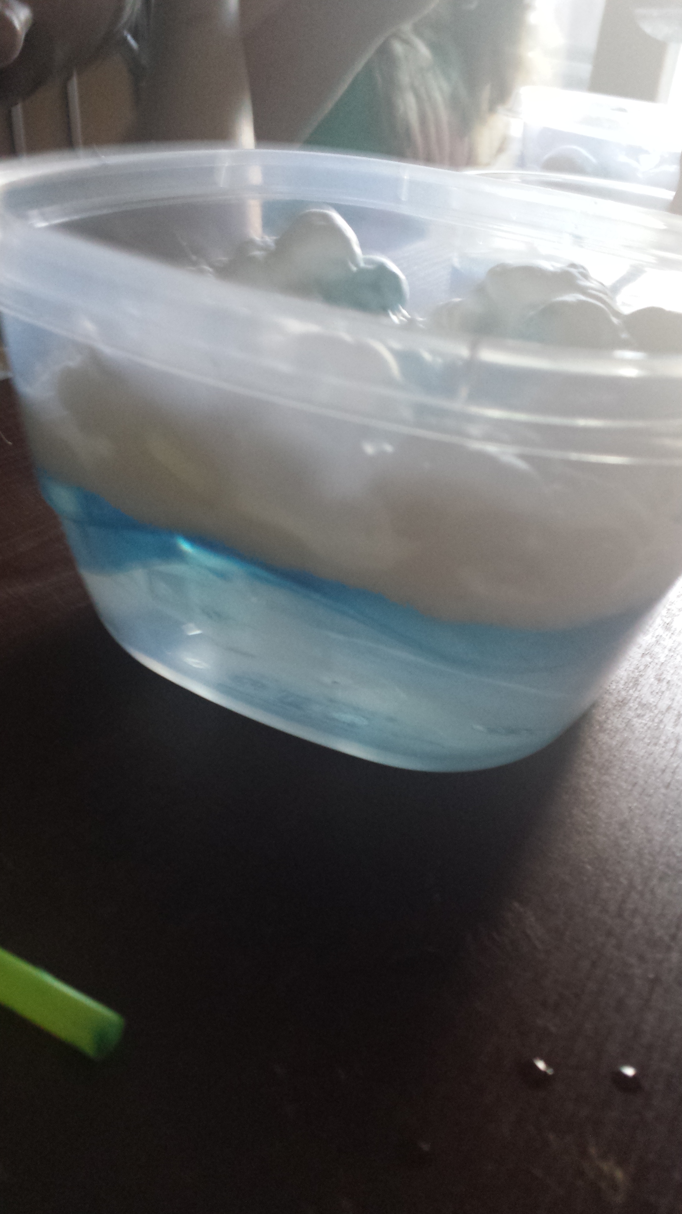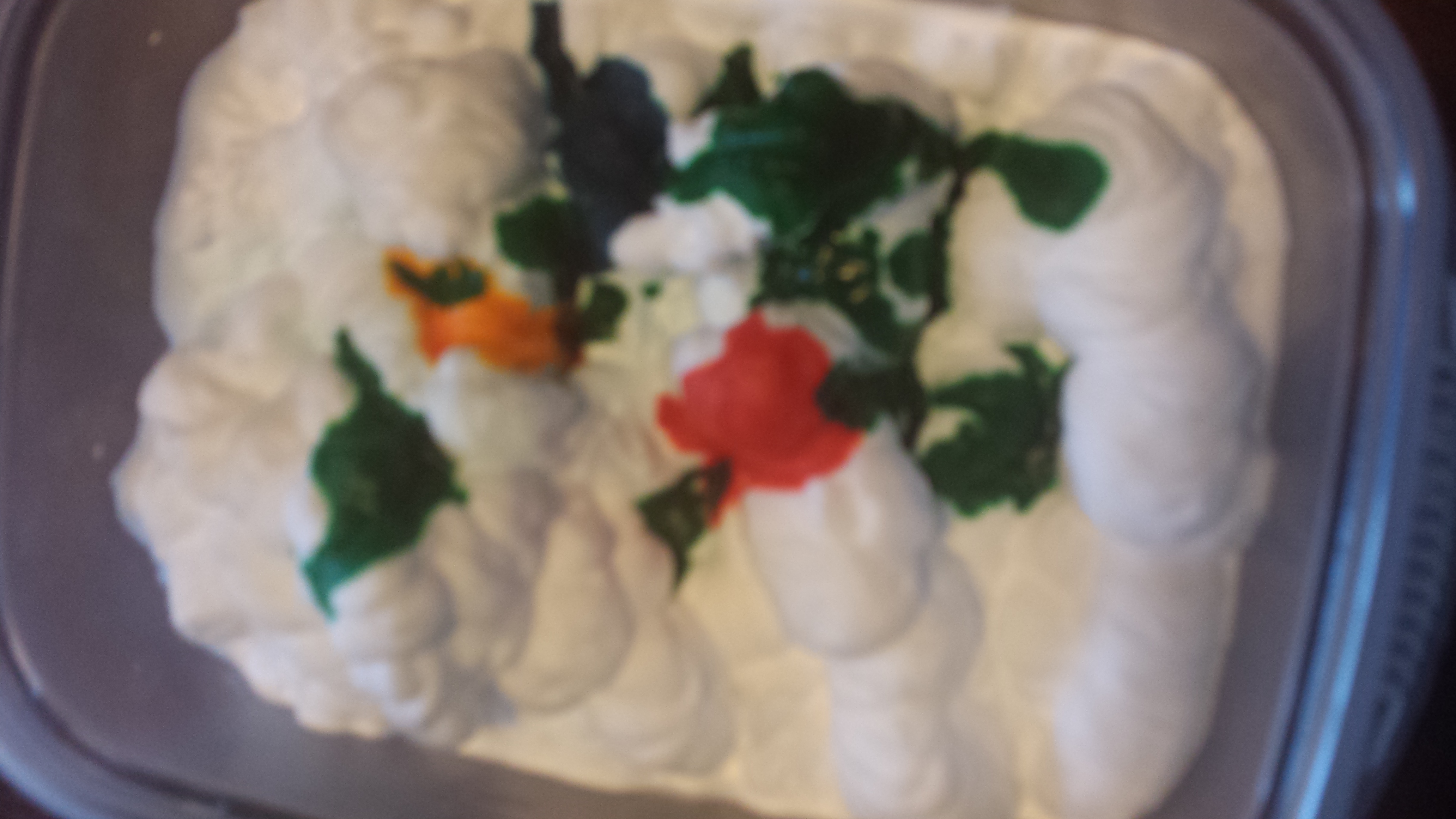 I then took shaving cream (not the gel) and put it on the top of the water. (Water represented air and the shaving cream was clouds. After that you were supposed to take blue food coloring and put it in water to create “rain.” You had to take a medicine dropper and drop them in. I didn’t have a medicine dropper so I tried using a straw that I had cut up. This did not work at all. I just ended up giving the kiddos the food coloring bottles and let them have at it. None of the kids really caught onto the whole lesson (A sort of did) but it was still fun. All of their clouds turned out really pretty and colorful.