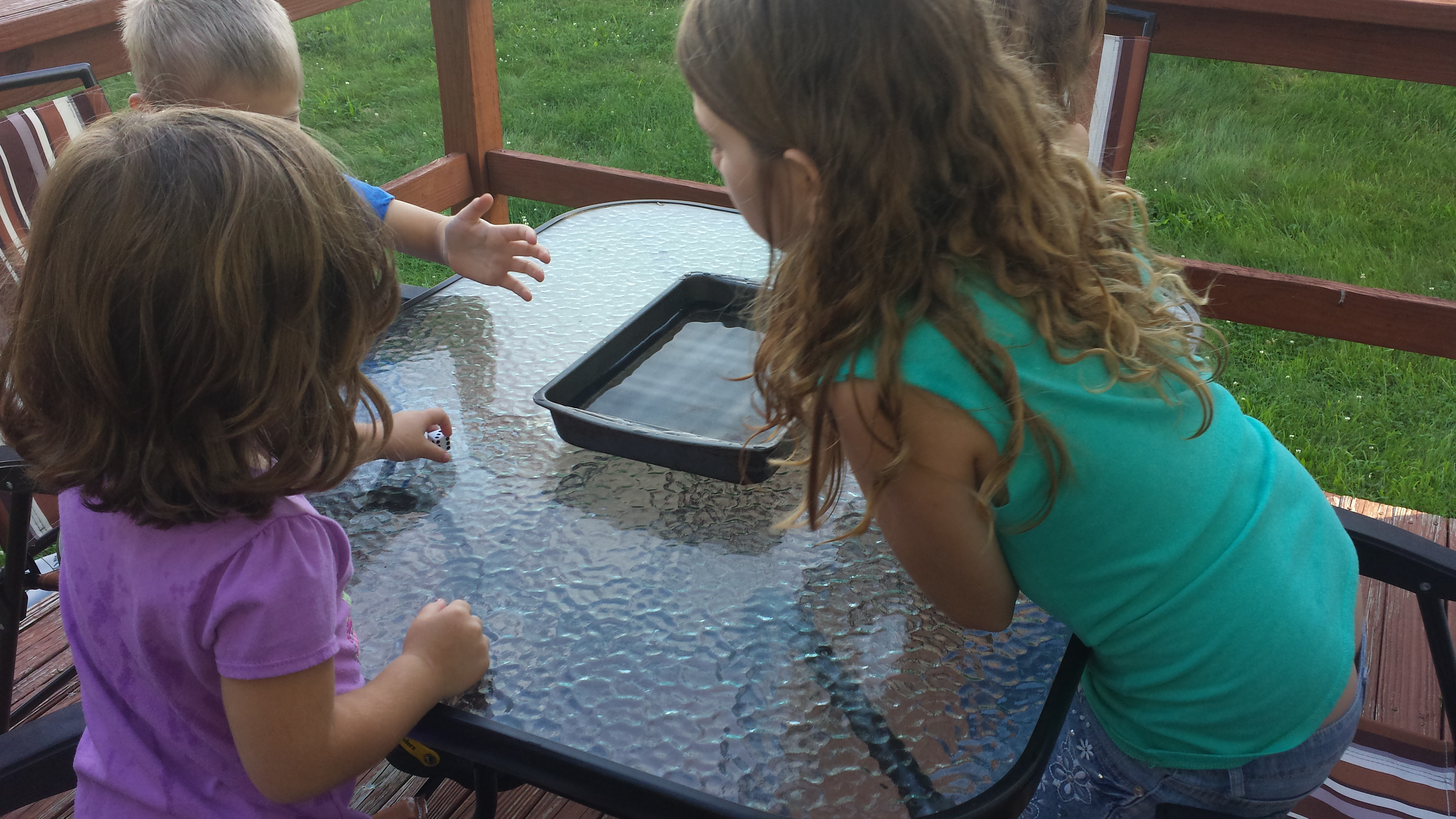 This is a continuation from the last page. There isnt much to go along with this post. For this game we just got a pan and filled it up with water. I also pulled a die out from one of our many board game. The kids all sat around in a circle and took turns rolling the die. They all rolled until they hit a 6. (Hence the name of the game) If they got a 6 they splashed the water trying to get everyone wet. We went around until everyone had a chance to go. They had a blast playing this game. I think it has become a family favorite.
