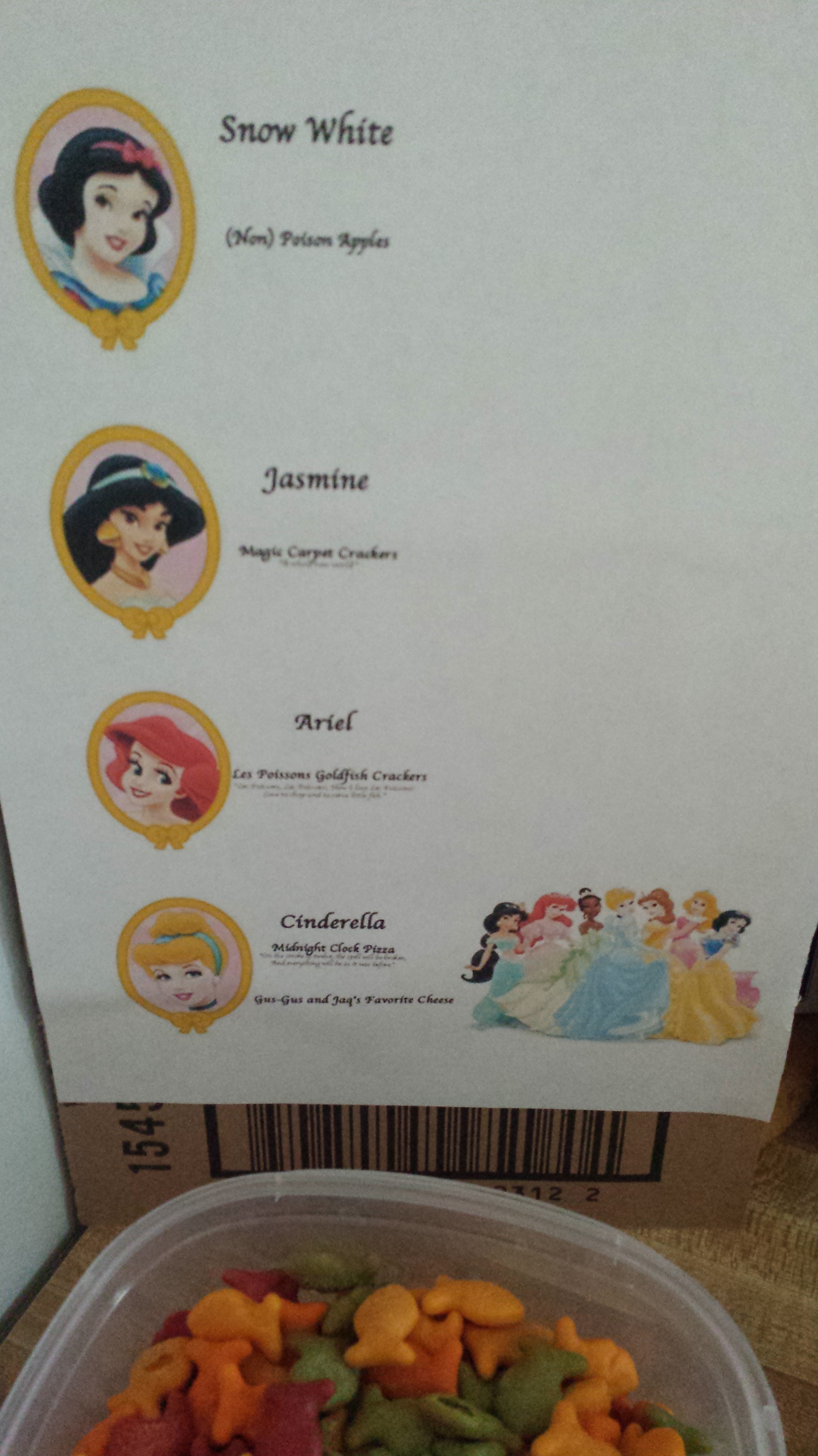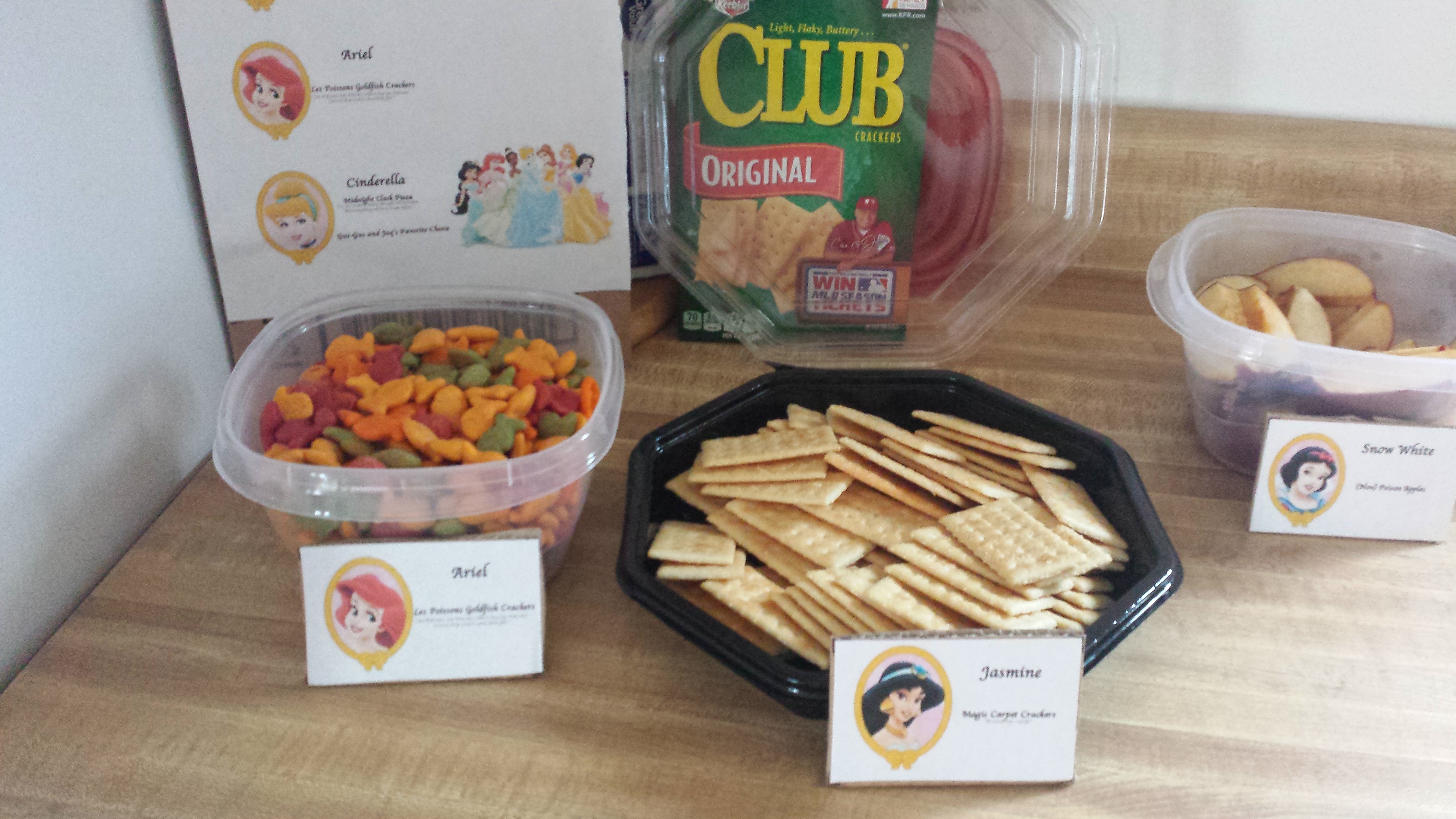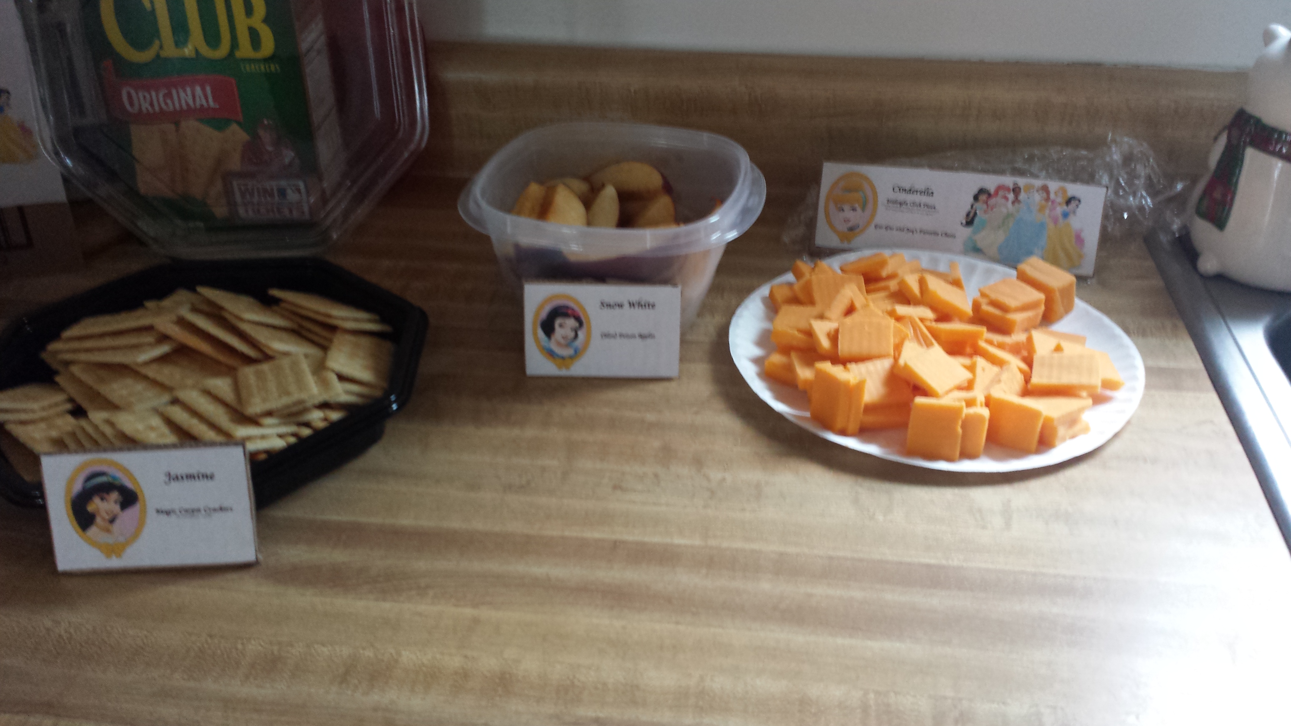 The food was good. No one really ate the little snacks I made up. They basically stuck to the pizzas we had ordered. I had found a huge list of ideas but only picked a few of them. I am glad I did too. So to snack on there was Snow whites (non) poison apples. Les Poisson’s goldfish crackers .(Ariel) Jaq and Gus-Gus cheese squares. (Cinderella) Jasmines magic carpet crackers. (Club crackers) The main meal was Cinderella’s clock tower pizza.