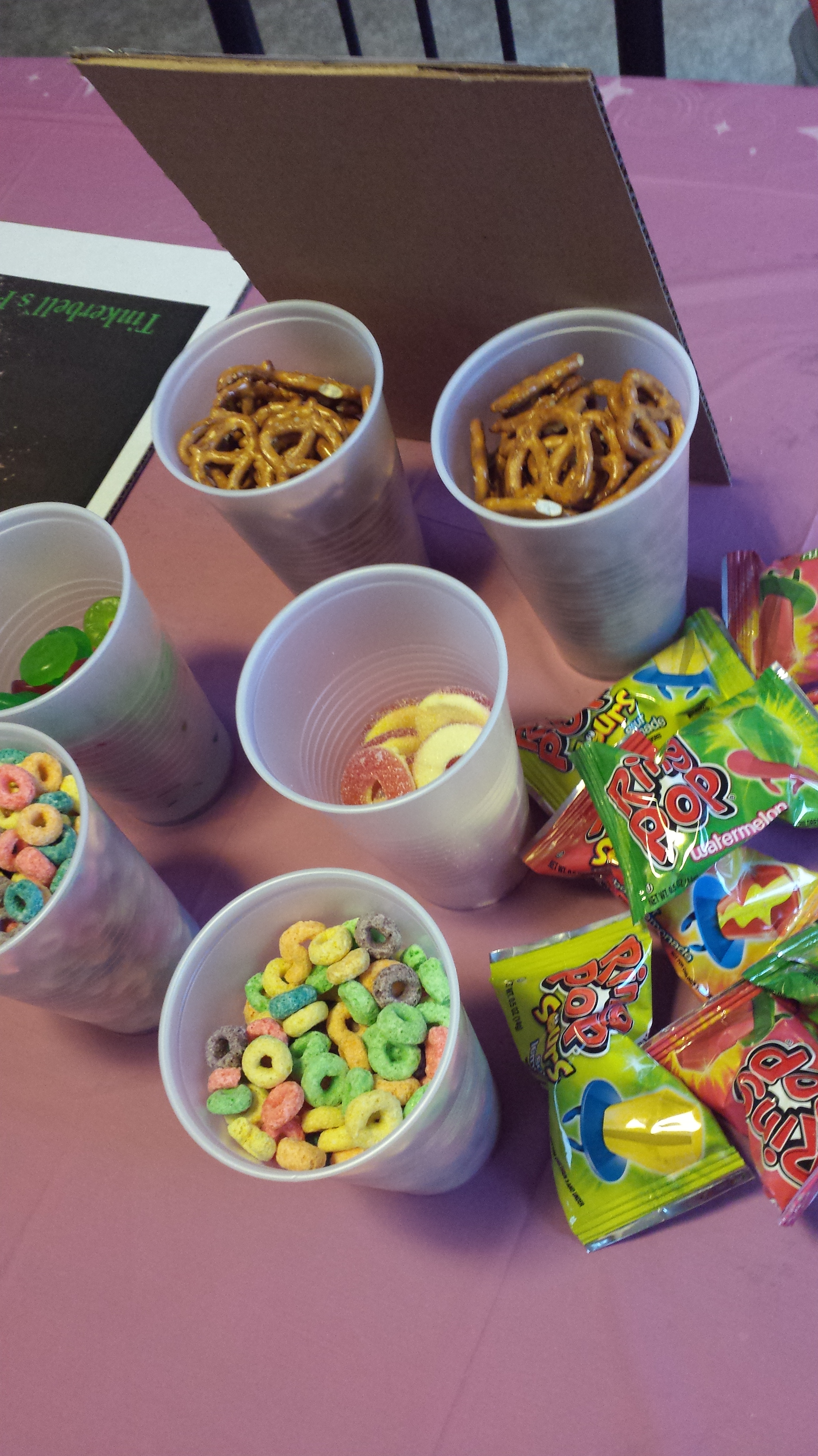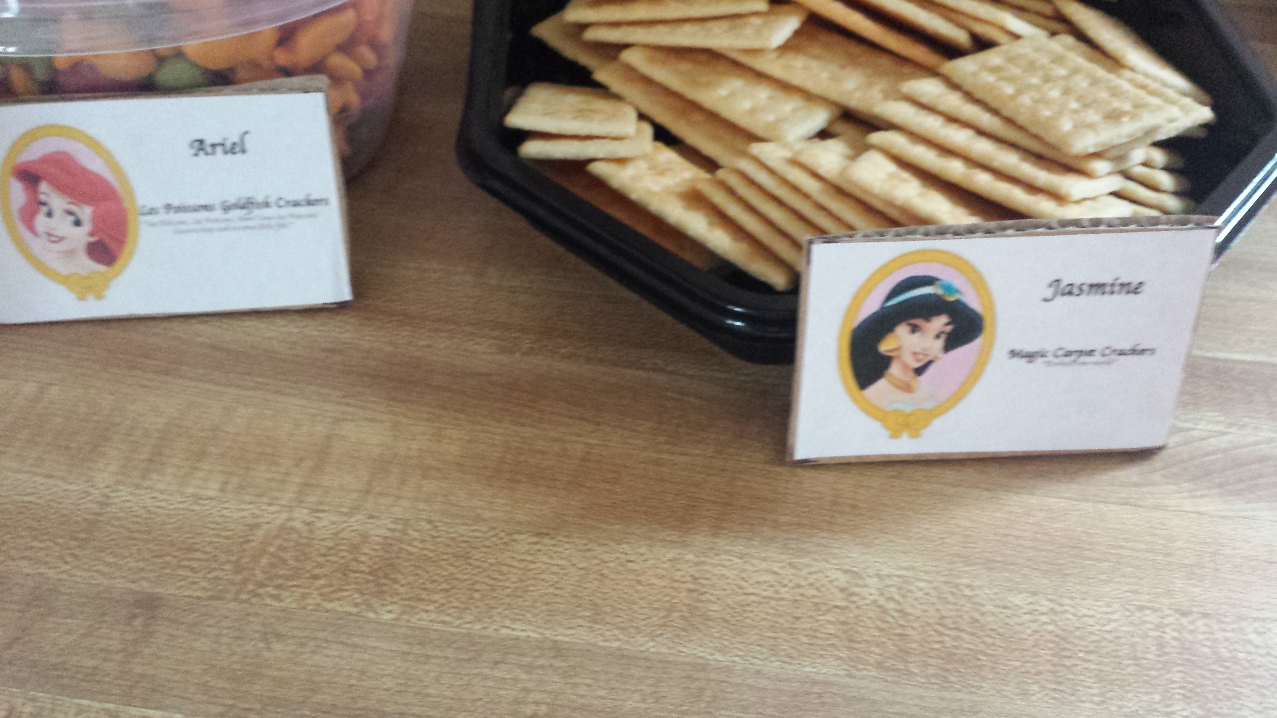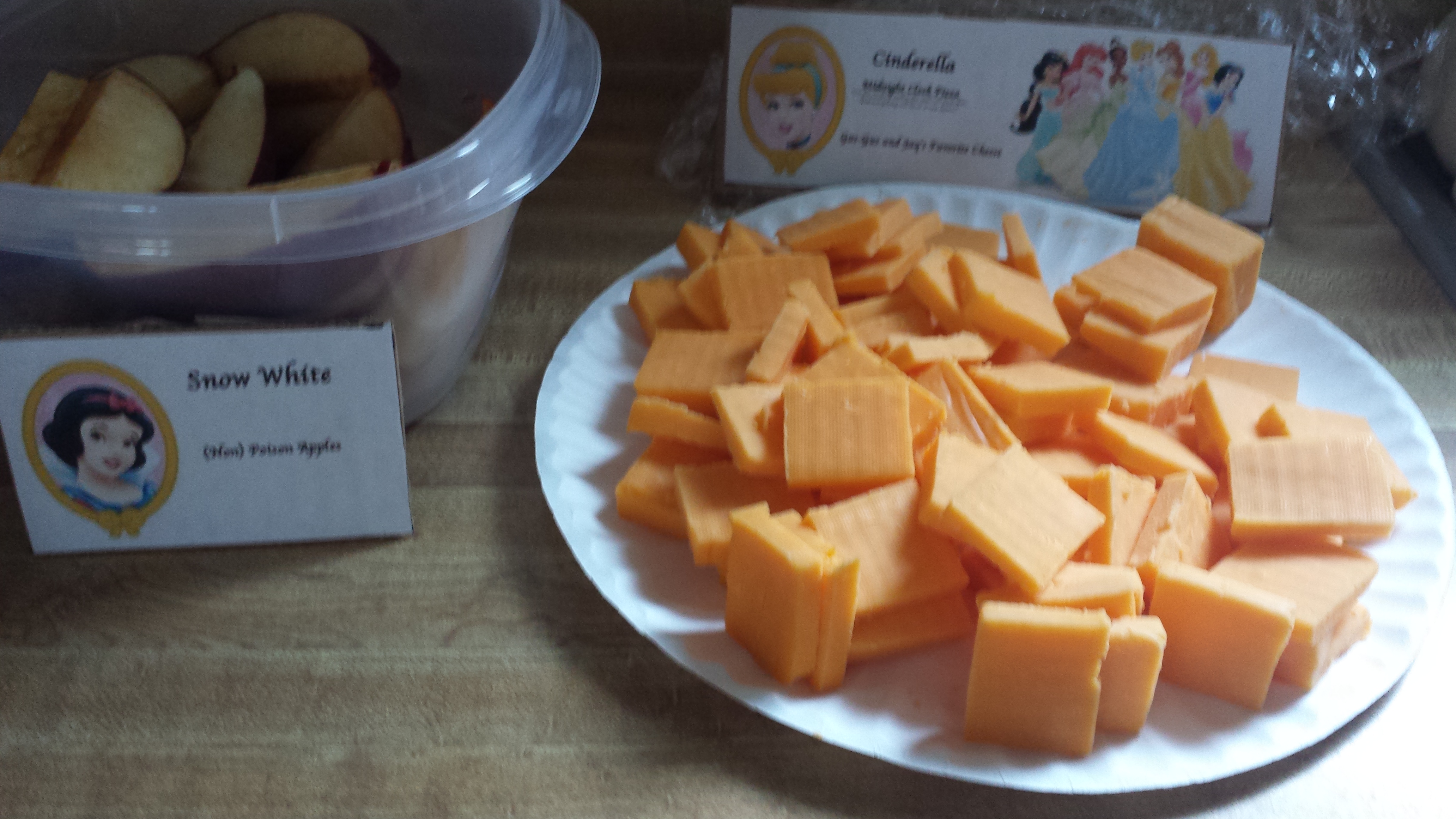 The food was good. No one really ate the little snacks I made up. They basically stuck to the pizzas we had ordered. I had found a huge list of ideas but only picked a few of them. I am glad I did too. So to snack on there was Snow whites (non) poison apples. Les Poisson’s goldfish crackers .(Ariel) Jaq and Gus-Gus cheese squares. (Cinderella) Jasmines magic carpet crackers. (Club crackers) The main meal was Cinderella’s clock tower pizza.