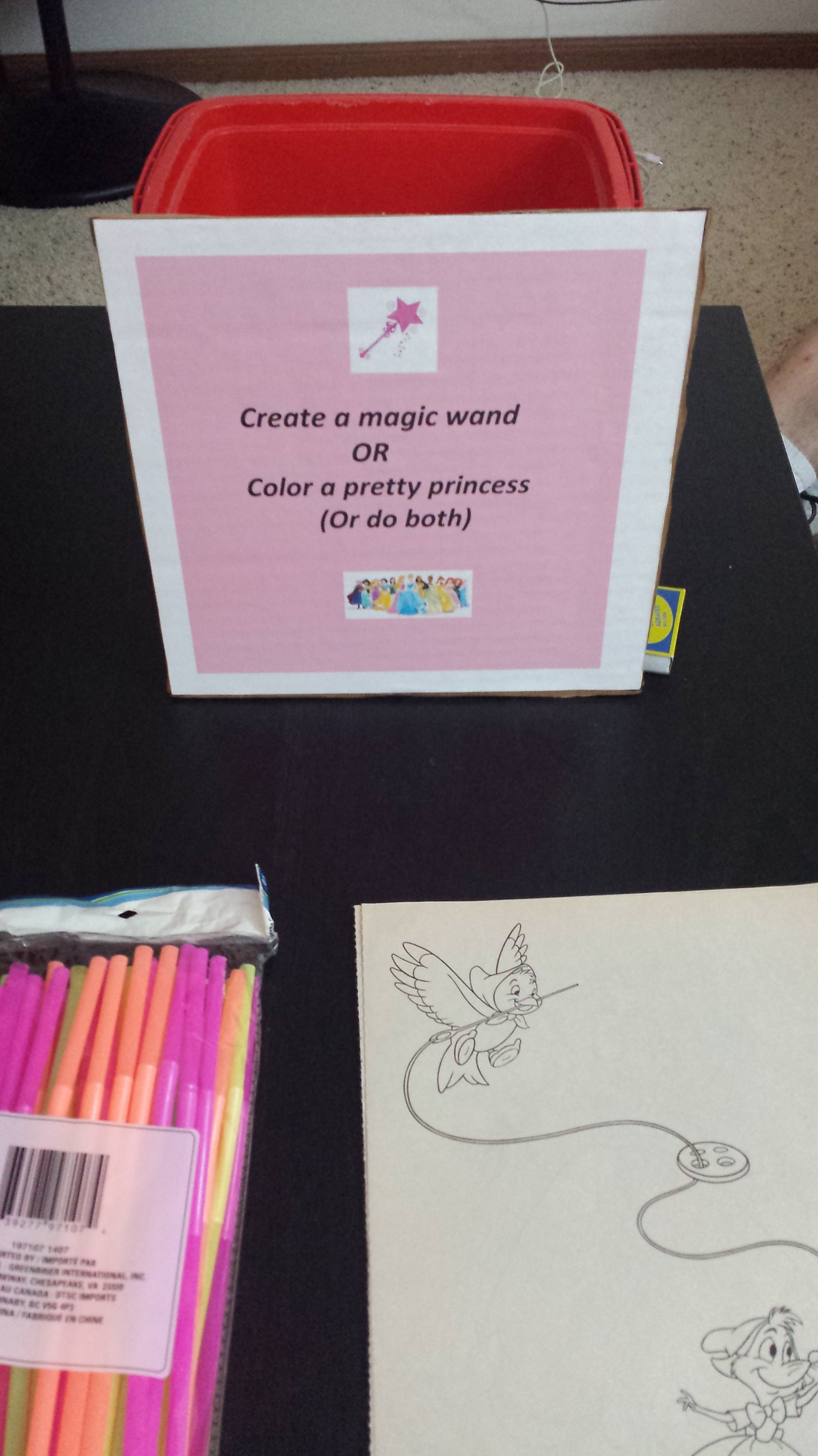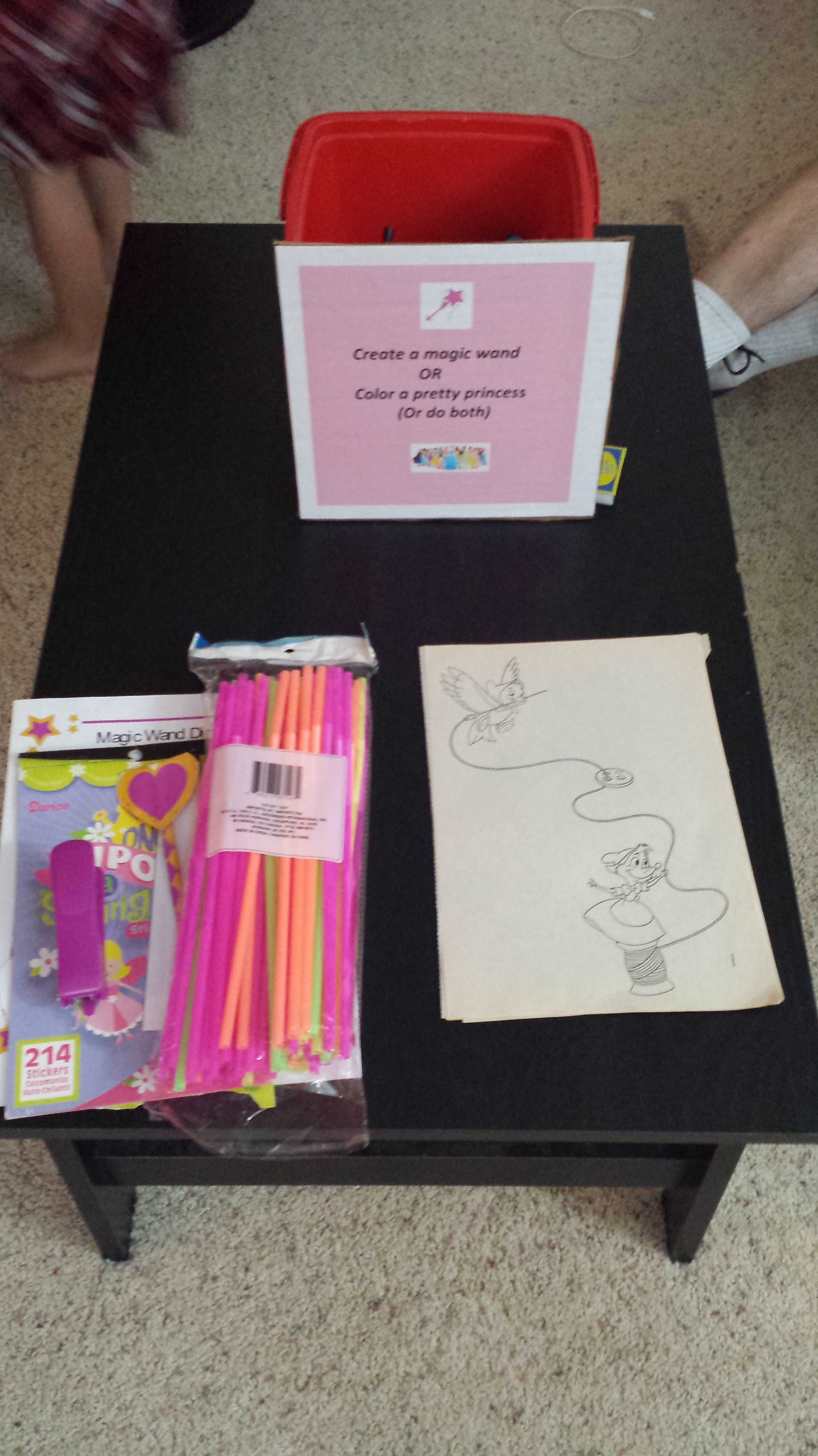 While the kids waited for me to get everything set up in the kitchen had them color princess pages (that I had just ripped out of a coloring book) and make magic wands.