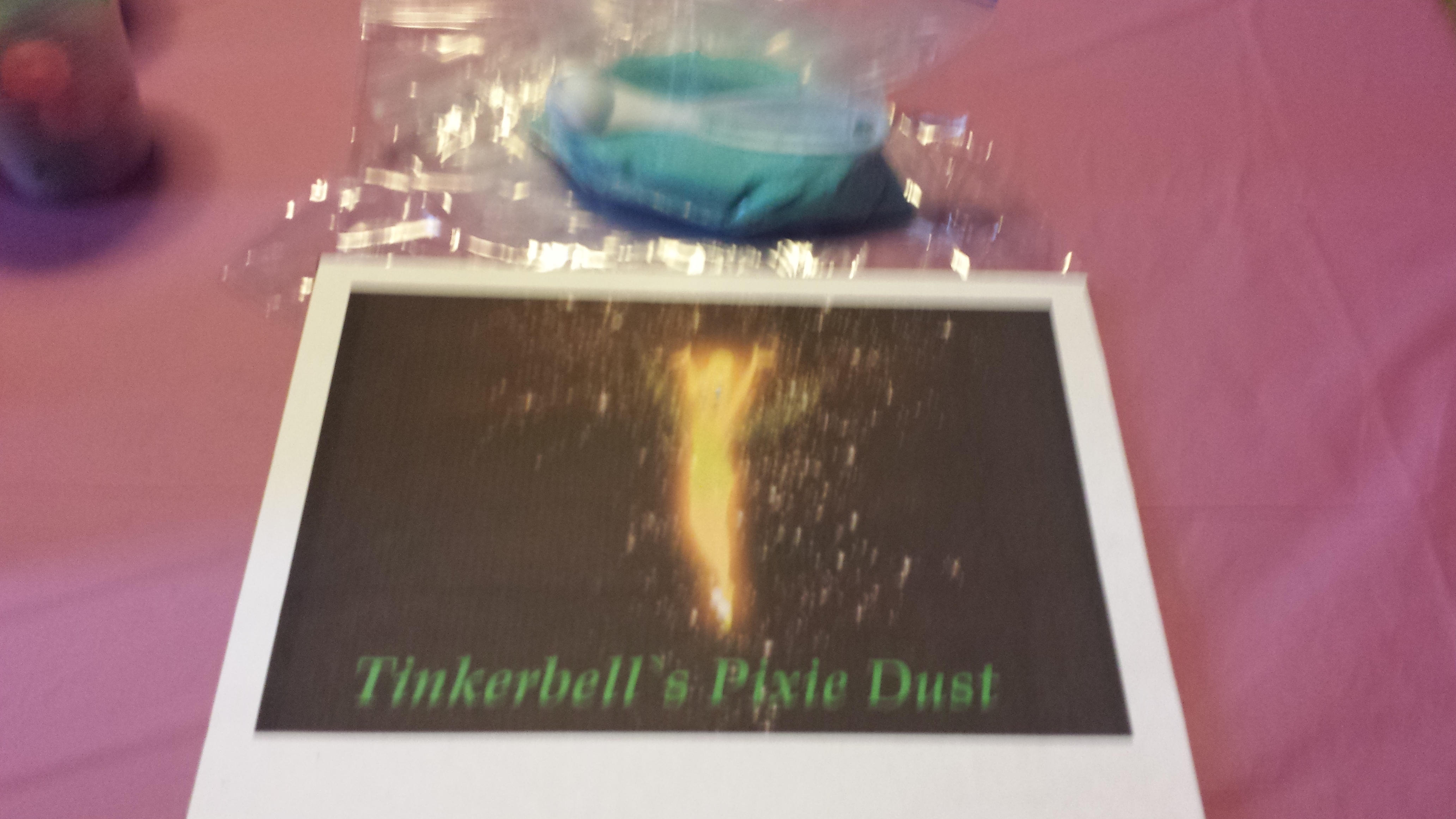 The younger kids all thought this was cool. The oldest not so much. Tinkerbell`s fairy dust. Once again I used paint for the picture following the same steps as above. The fairy dust was just salt and blue food coloring. I used one cup salt and 10 drops of food coloring. I just mixed it all up in a Ziploc bag. After it was all blue I added glitter. I let the kids scoop out their own dust and put it into their own baggies.