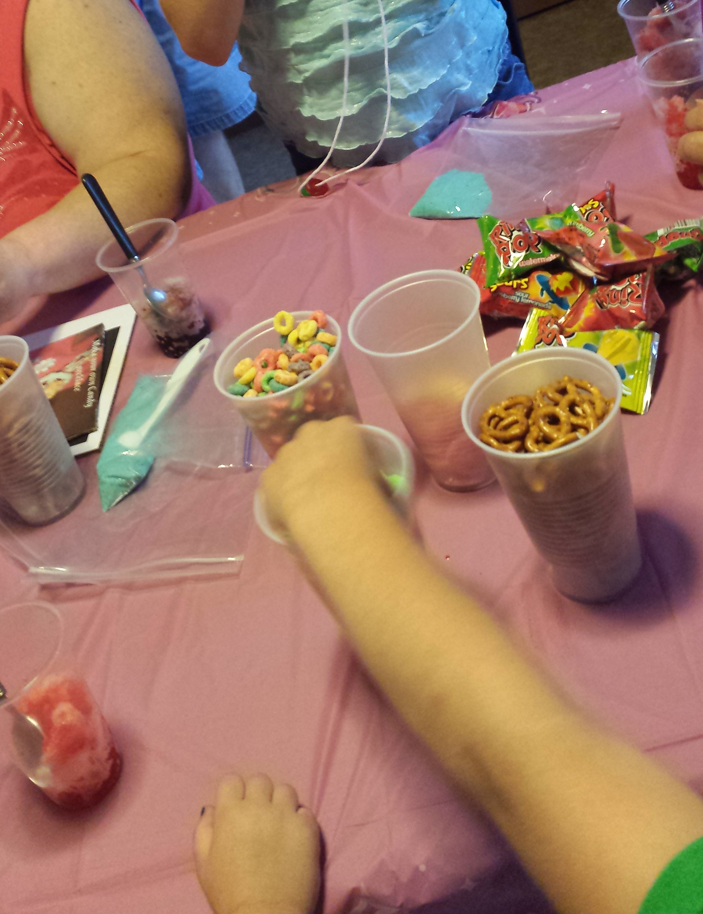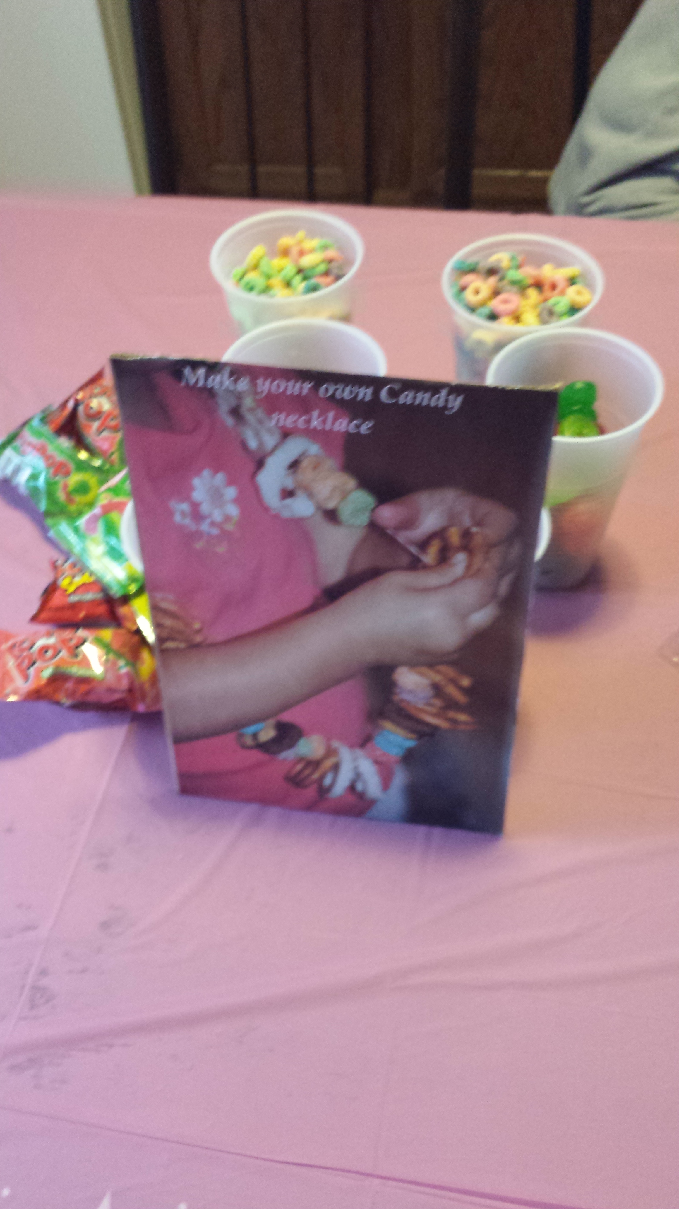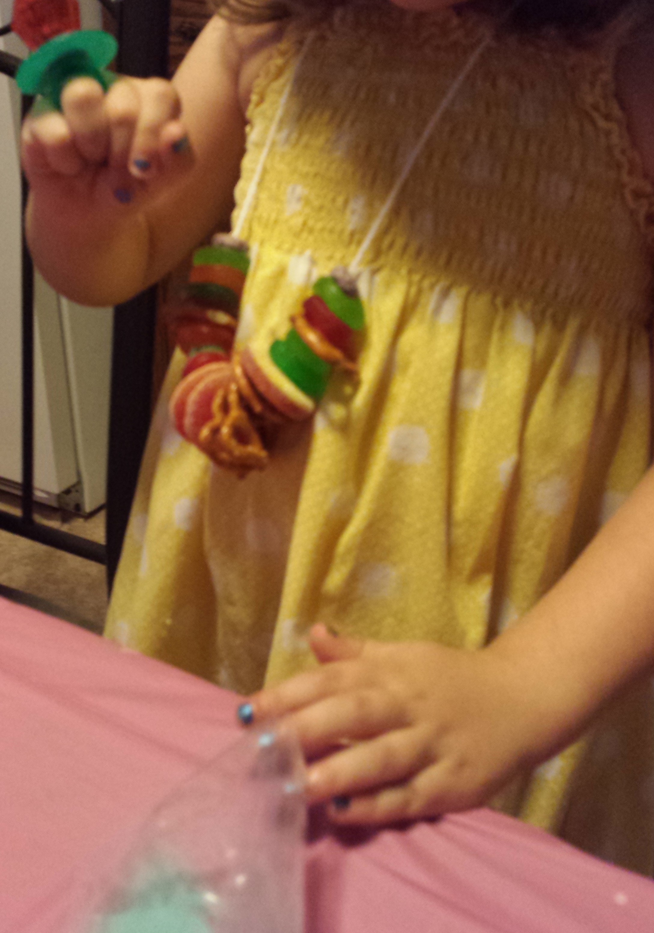 Next is the “candy” necklaces the kids made. This was probably their favorite thing at the party. I got various circular snacks: peach rings, pretzels, life saver gummies, and fruit loops. I put them all into various plastic cups. I had bought yarn to use for the actual necklace part. I went around to all the kids and measured their yarn out to where they could take it off and on easily. I just put the yarn around their neck and made it big enough for them then cut the yarn. Then the kids went to town. They all picked what they wanted and how they wanted it to be placed on. My mom and S helped out a lot with this one. After the kids finished their necklaces they all got ring pops so they could be completely dazzling.
