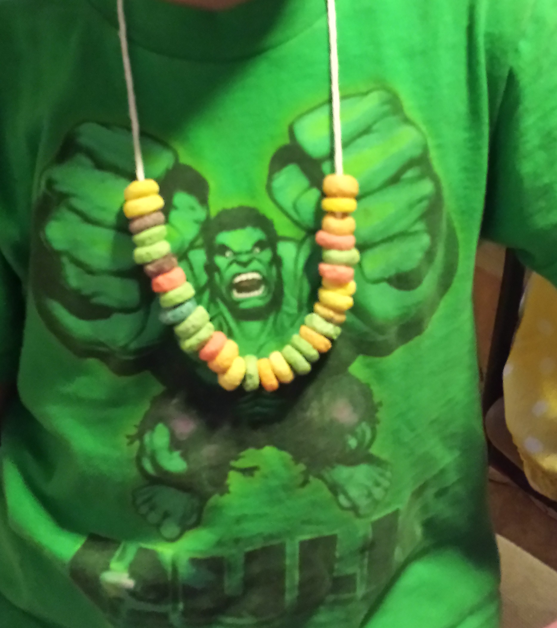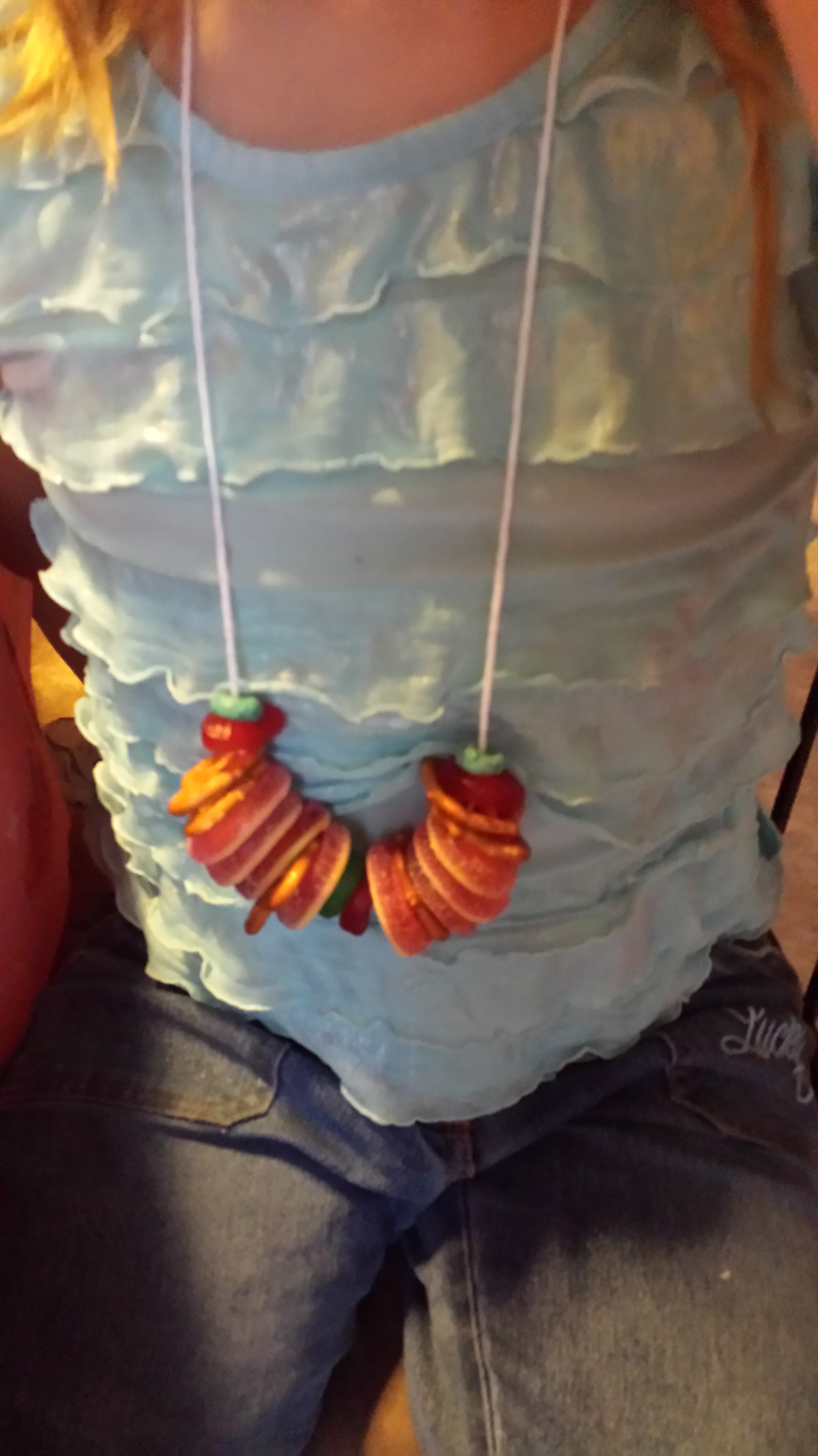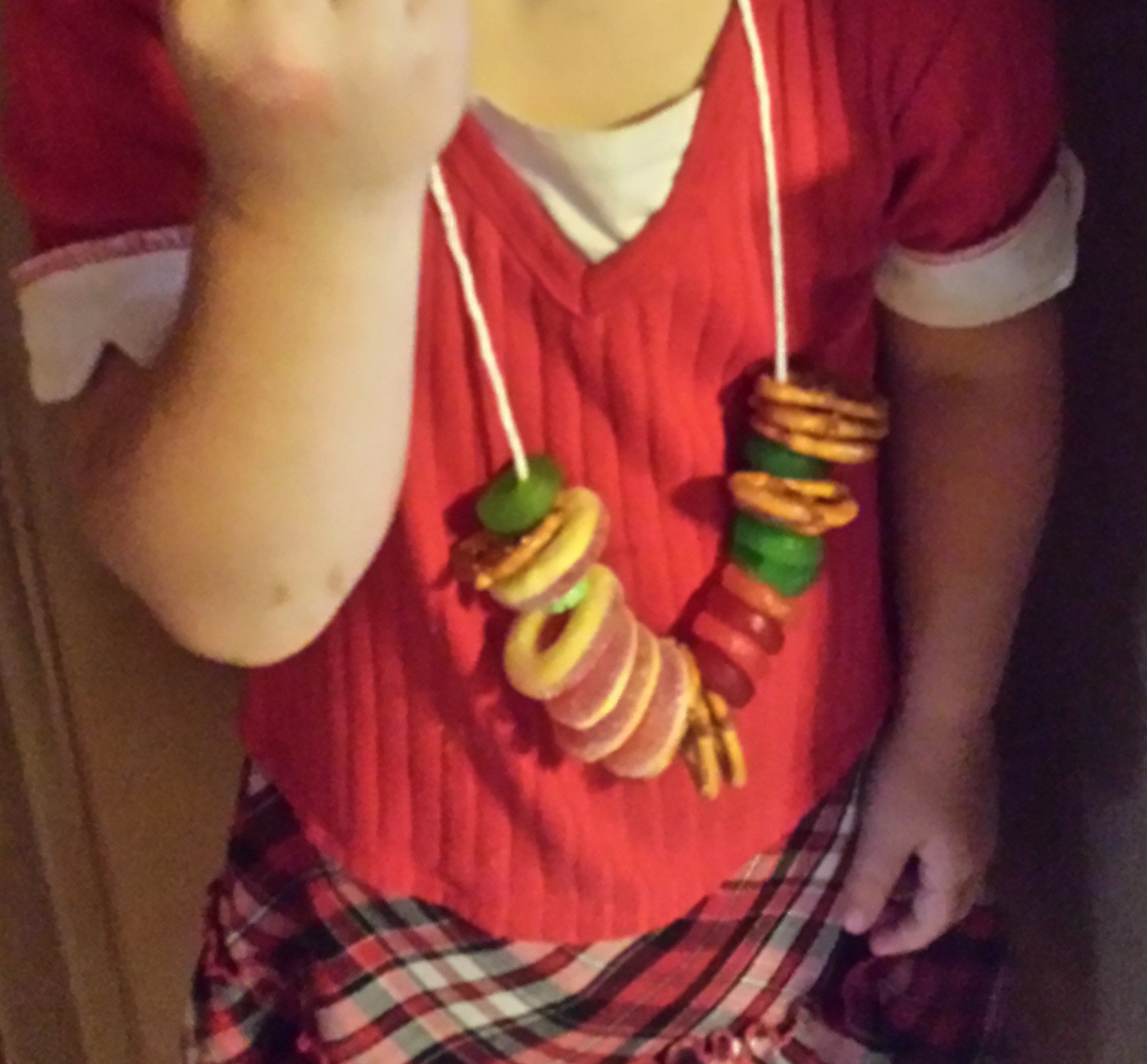 Next is the “candy” necklaces the kids made. This was probably their favorite thing at the party. I got various circular snacks: peach rings, pretzels, life saver gummies, and fruit loops. I put them all into various plastic cups. I had bought yarn to use for the actual necklace part. I went around to all the kids and measured their yarn out to where they could take it off and on easily. I just put the yarn around their neck and made it big enough for them then cut the yarn. Then the kids went to town. They all picked what they wanted and how they wanted it to be placed on. My mom and S helped out a lot with this one. After the kids finished their necklaces they all got ring pops so they could be completely dazzling.
