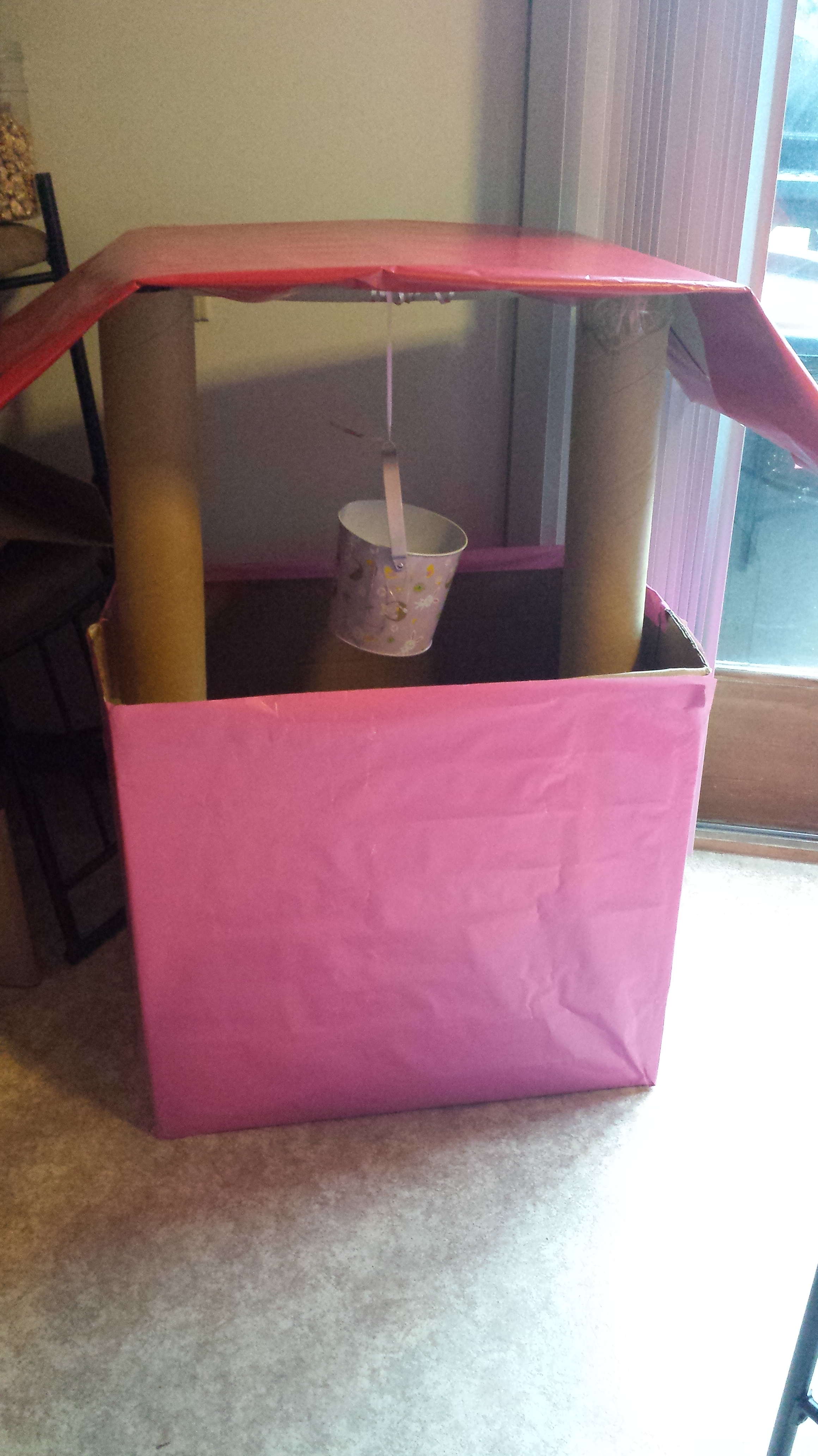 The first thing is my wishing well. There were two different sites I used for inspiration and I still couldn`t figure the dang thing out. So this was what I came up with. I took a big cardboard box and wrapped it up with wrapping paper. I then put 2 round tubes inside the box. To hold them up all I did was arrange some smaller boxes inside the big box. The top is just another piece of cardboard and wrapping paper. The bucket is an old Easter bucket the kids got awhile back held up with some string.