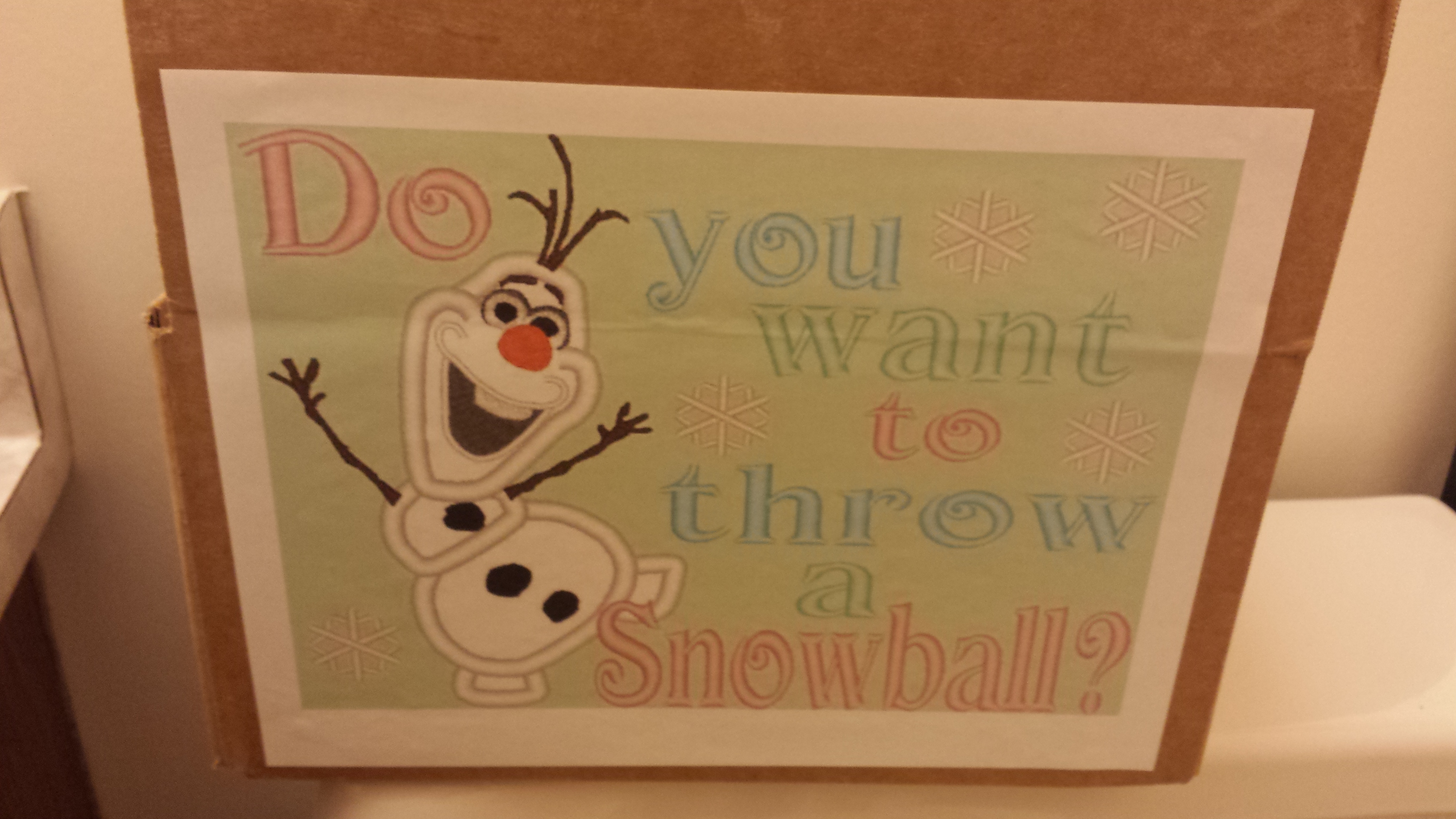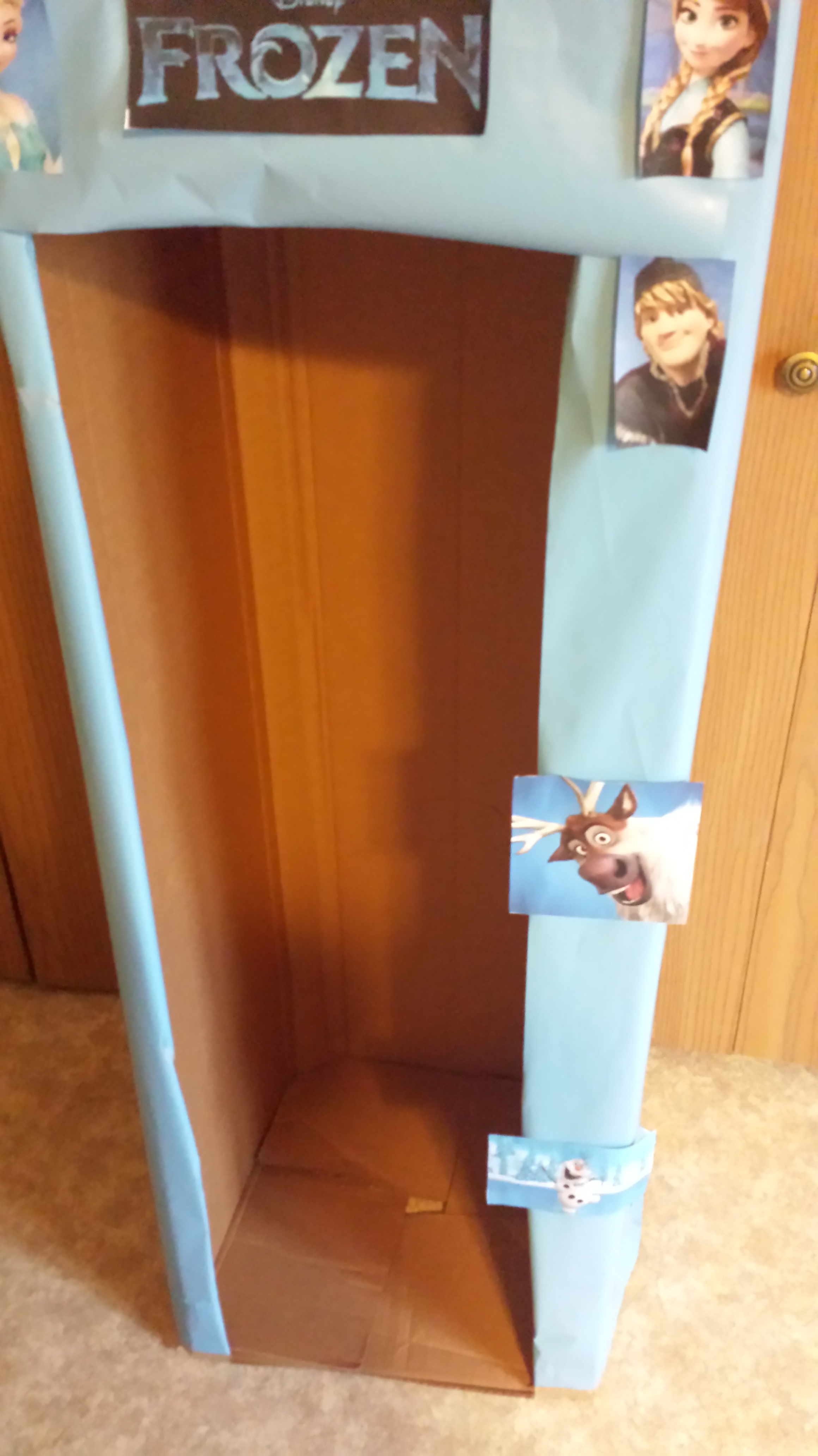 The rest of the games I just put together myself. We had a Frozen photo booth. Made out of a cardboard box, wrapping paper, and Frozen picture print offs I found online.