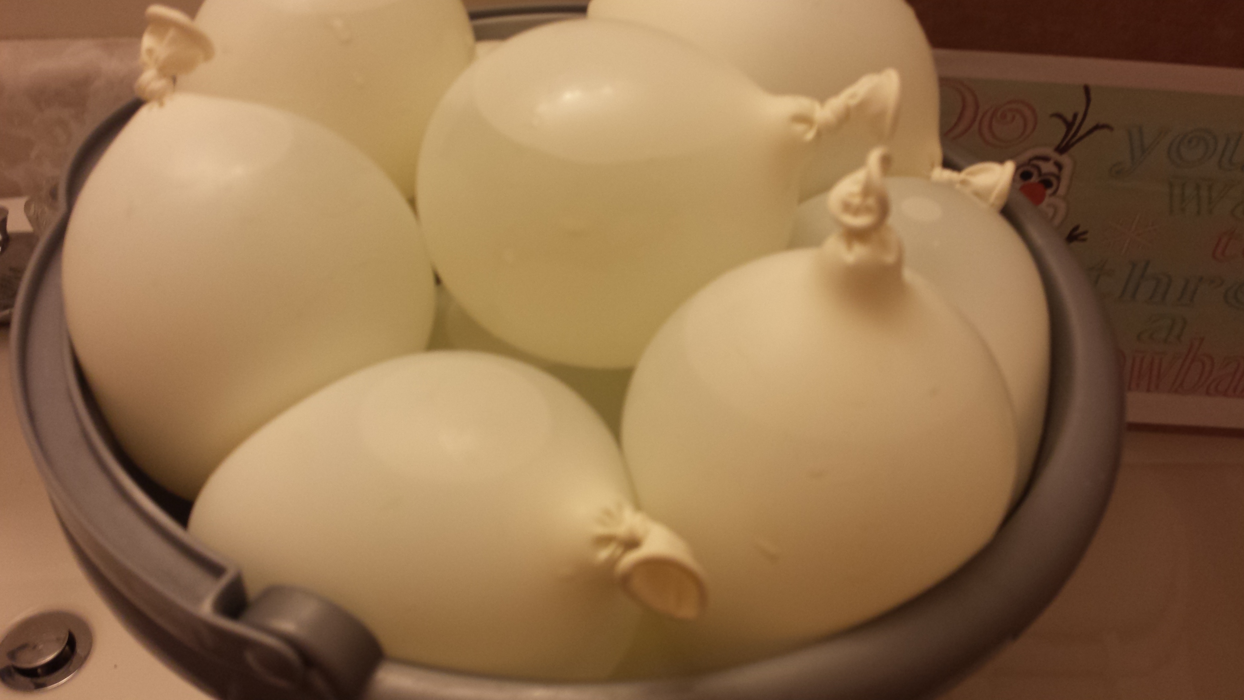 We had a “snowball fight.” Which was just a water balloon fight with white balloons. I got the balloons from Wal-mart and they WOULD not burst for anything. S was even throwing them and still nothing. So if you want super strong balloons, go to Wally.