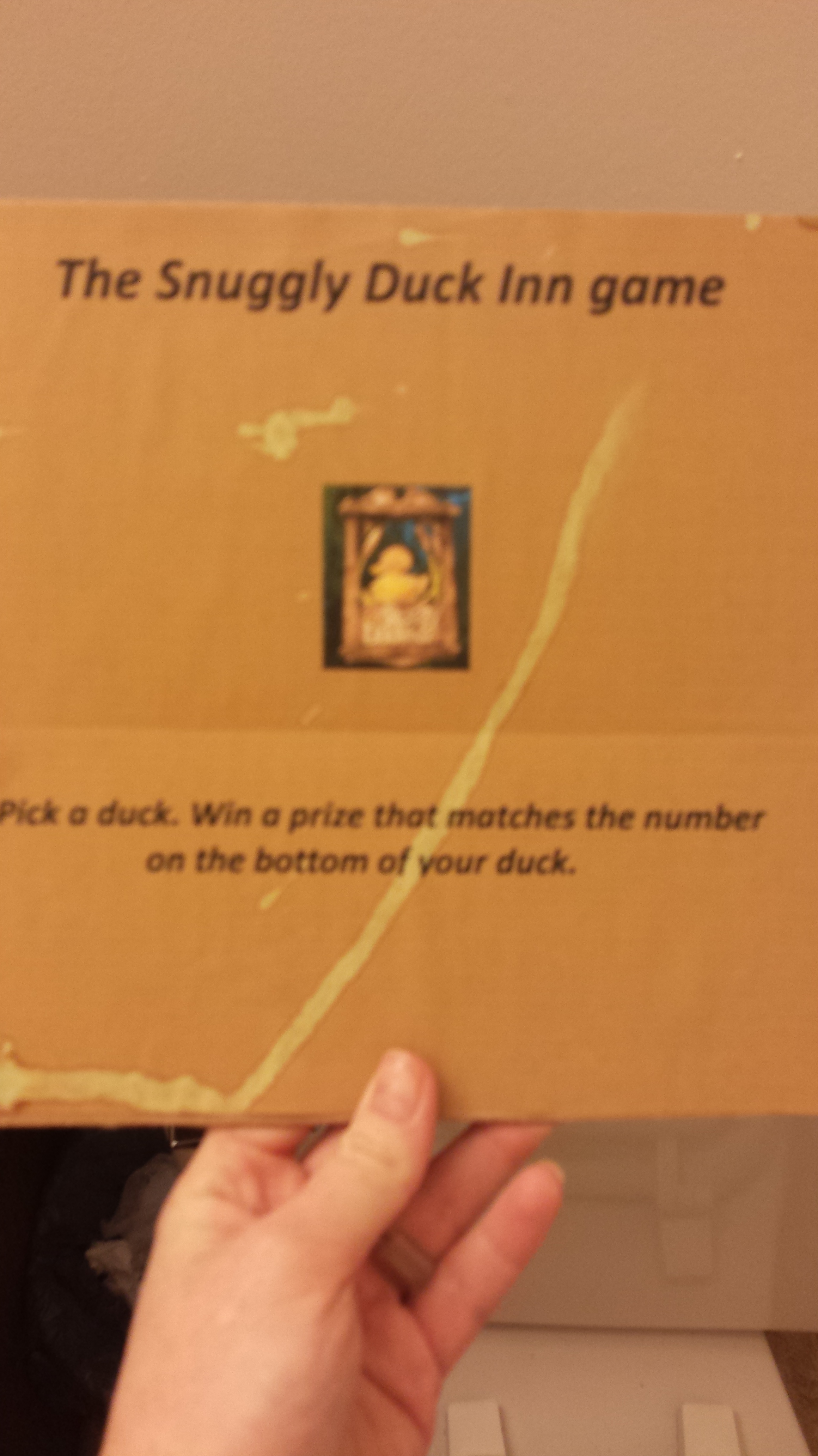 We played the snuggly Duck inn game. I bought some floating ducks ( I thought they would float anyways) and wrote the numbers 1 and 2 on the bottoms of them. I placed them in a bowl of water. The kids would each grab a duck and won a prize that coordinated with that duck. The prizes were Ice cream shop bubbles or Princess bracelets.