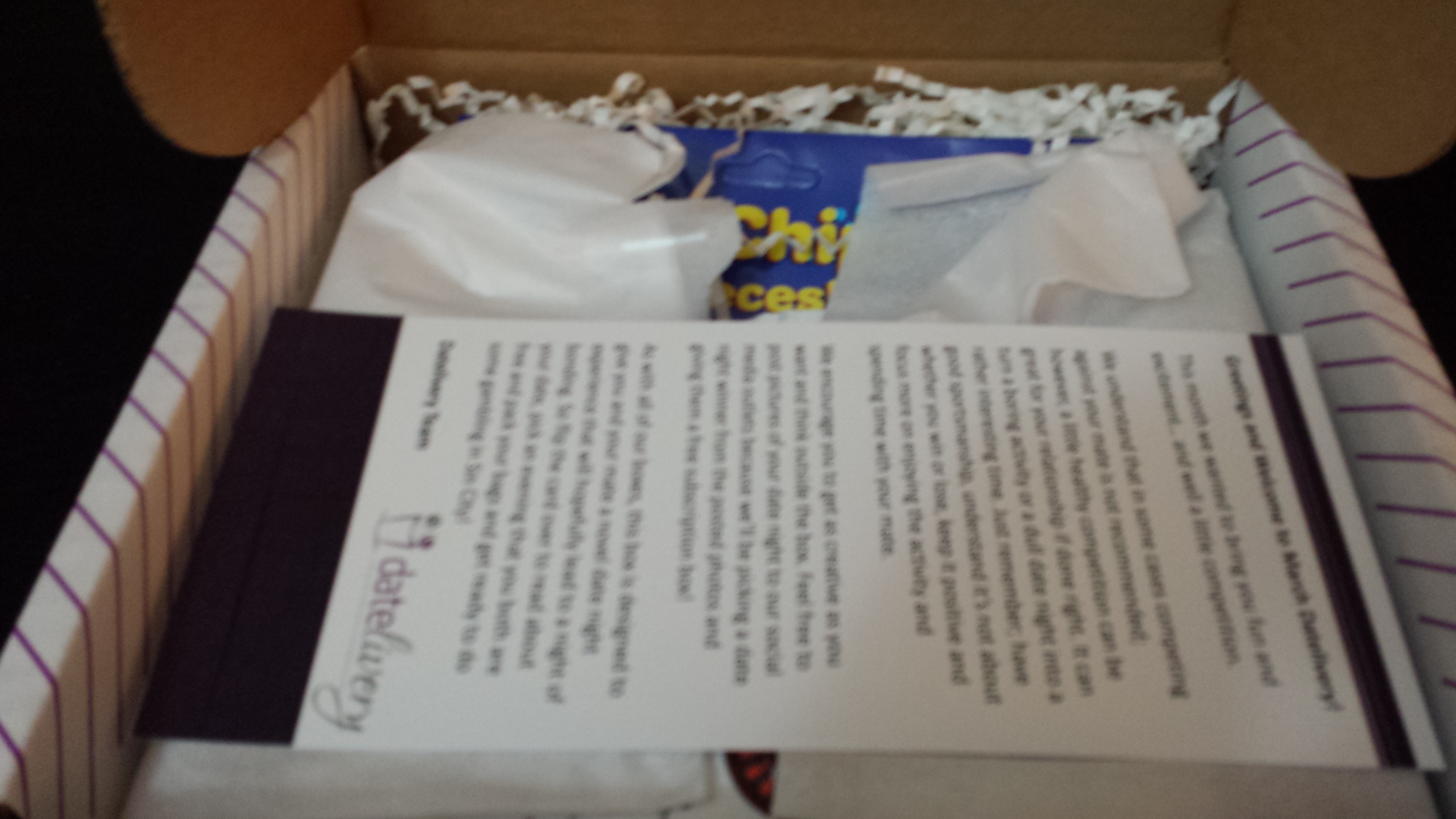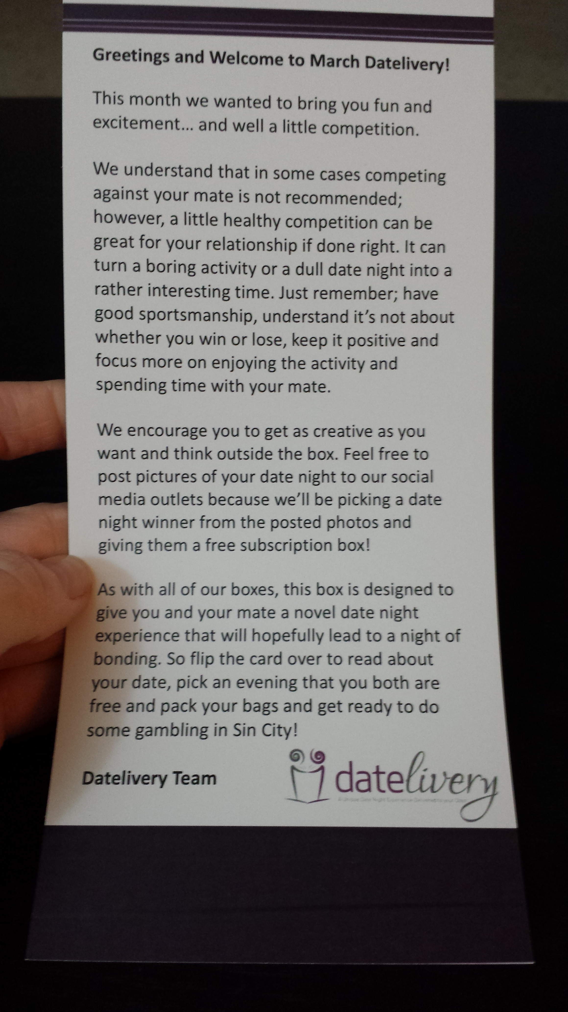 Greetings card from Datelivery. Covering the basics of their boxes. Also gives a glimpse of what will be in your box.