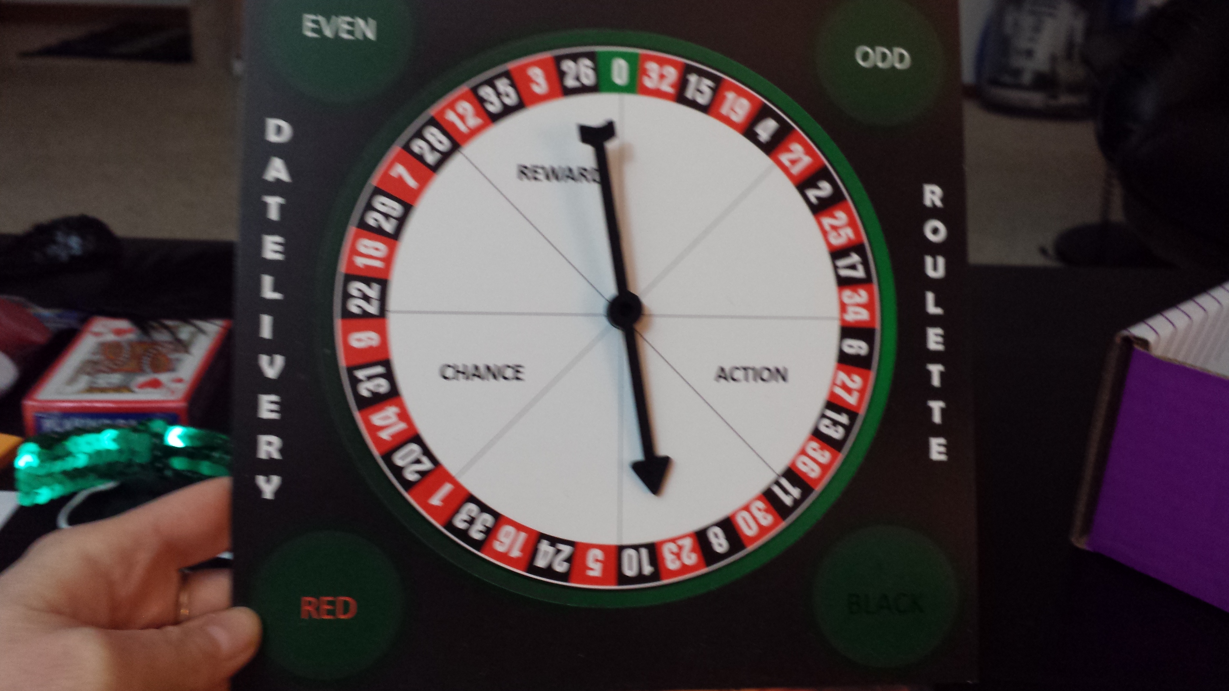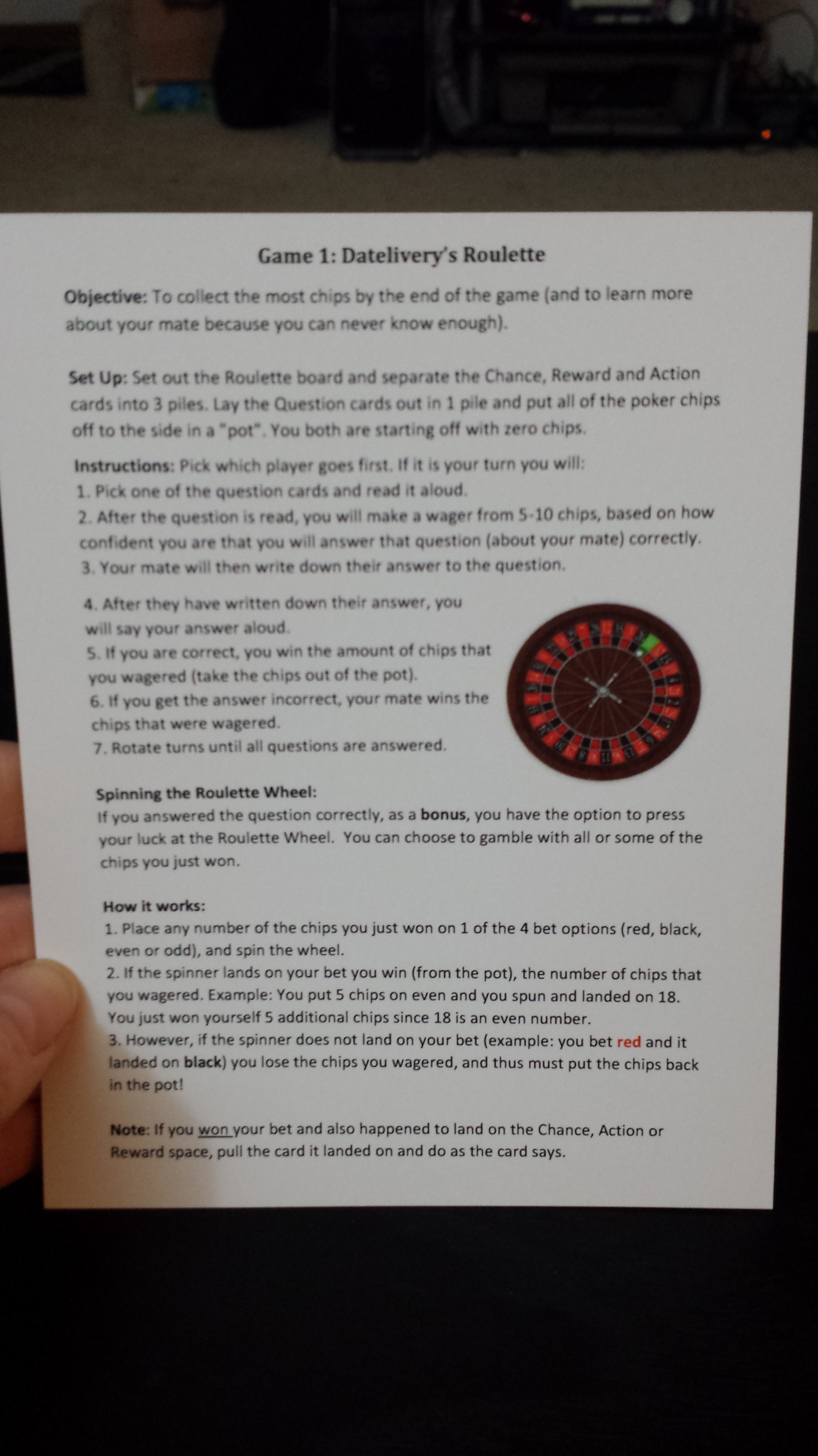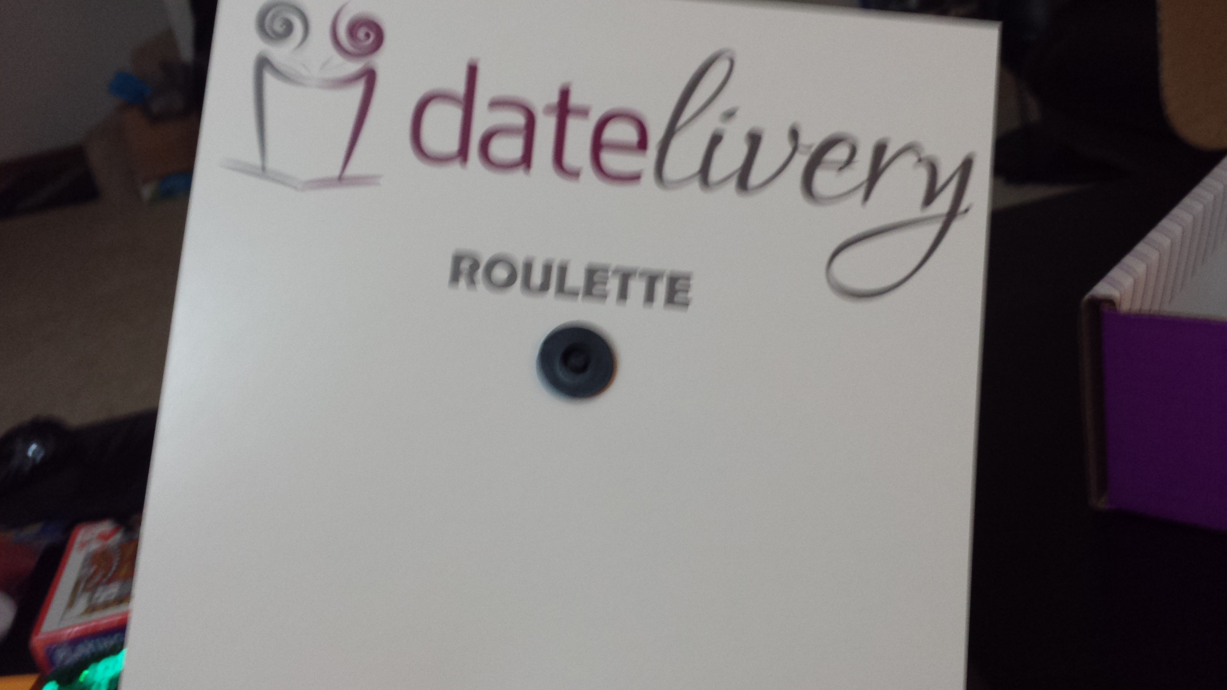 Game 1 was Roulette. This is the Datelivery roulette spin wheel. (front and back)