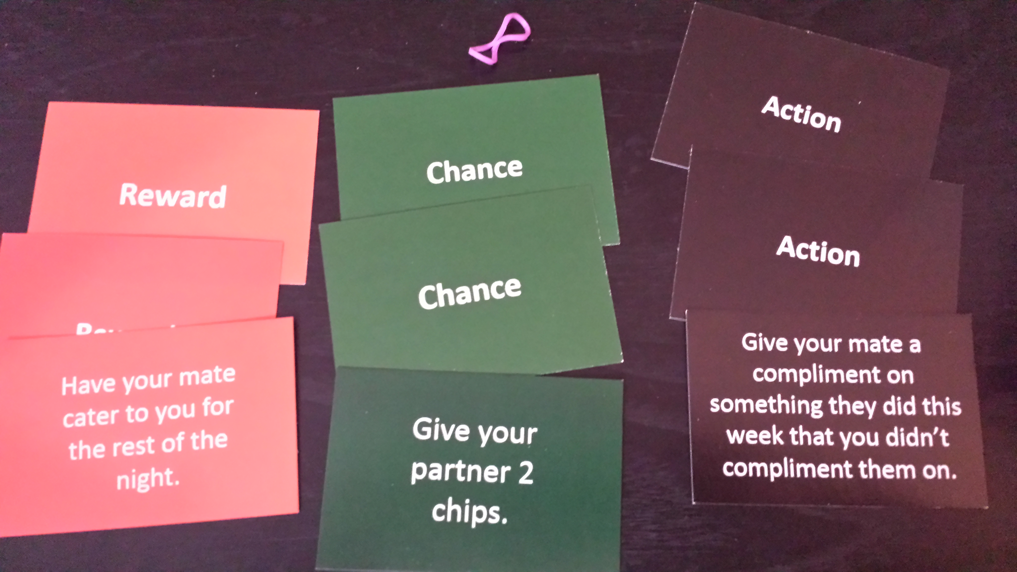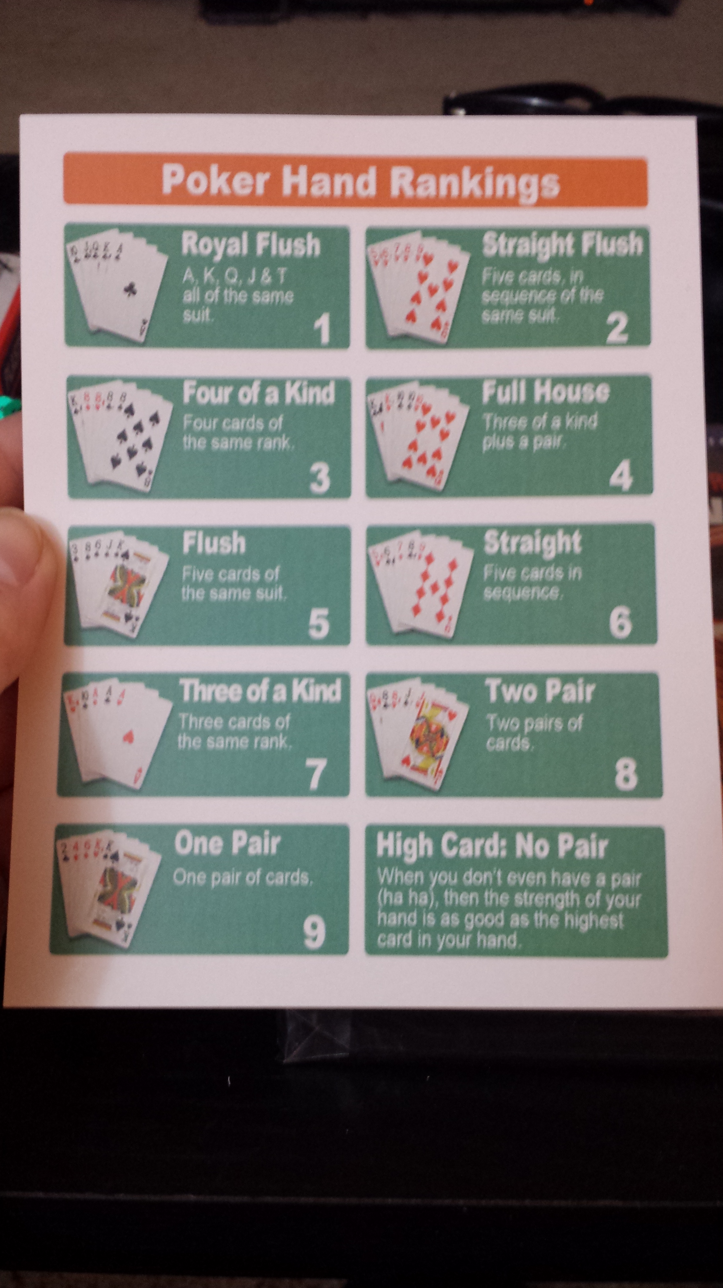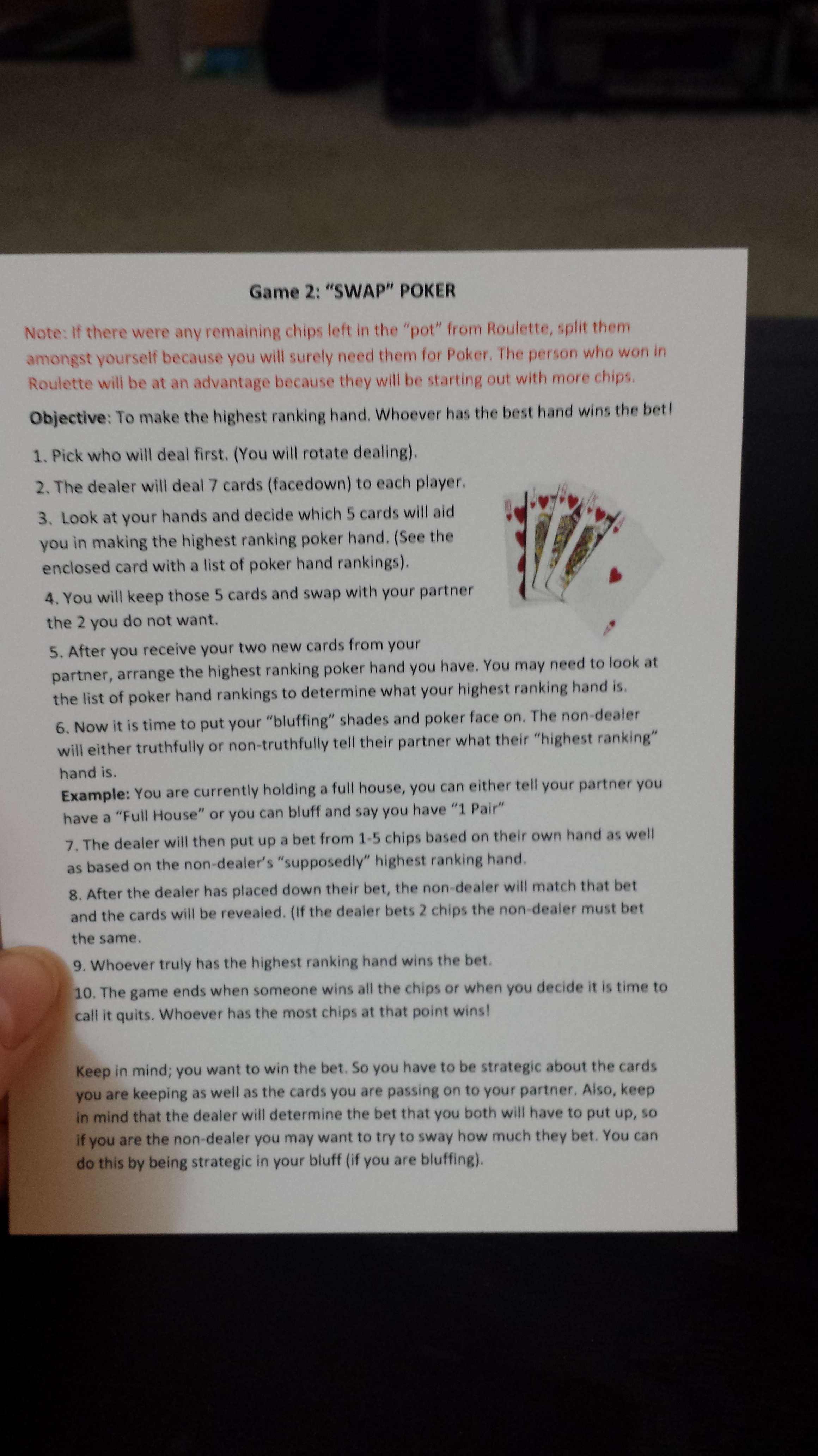 Game 2 was “swap” poker. These are the cards provided as well as a hand ranks card. (which was handy because neither me nor S knew how to play poker)