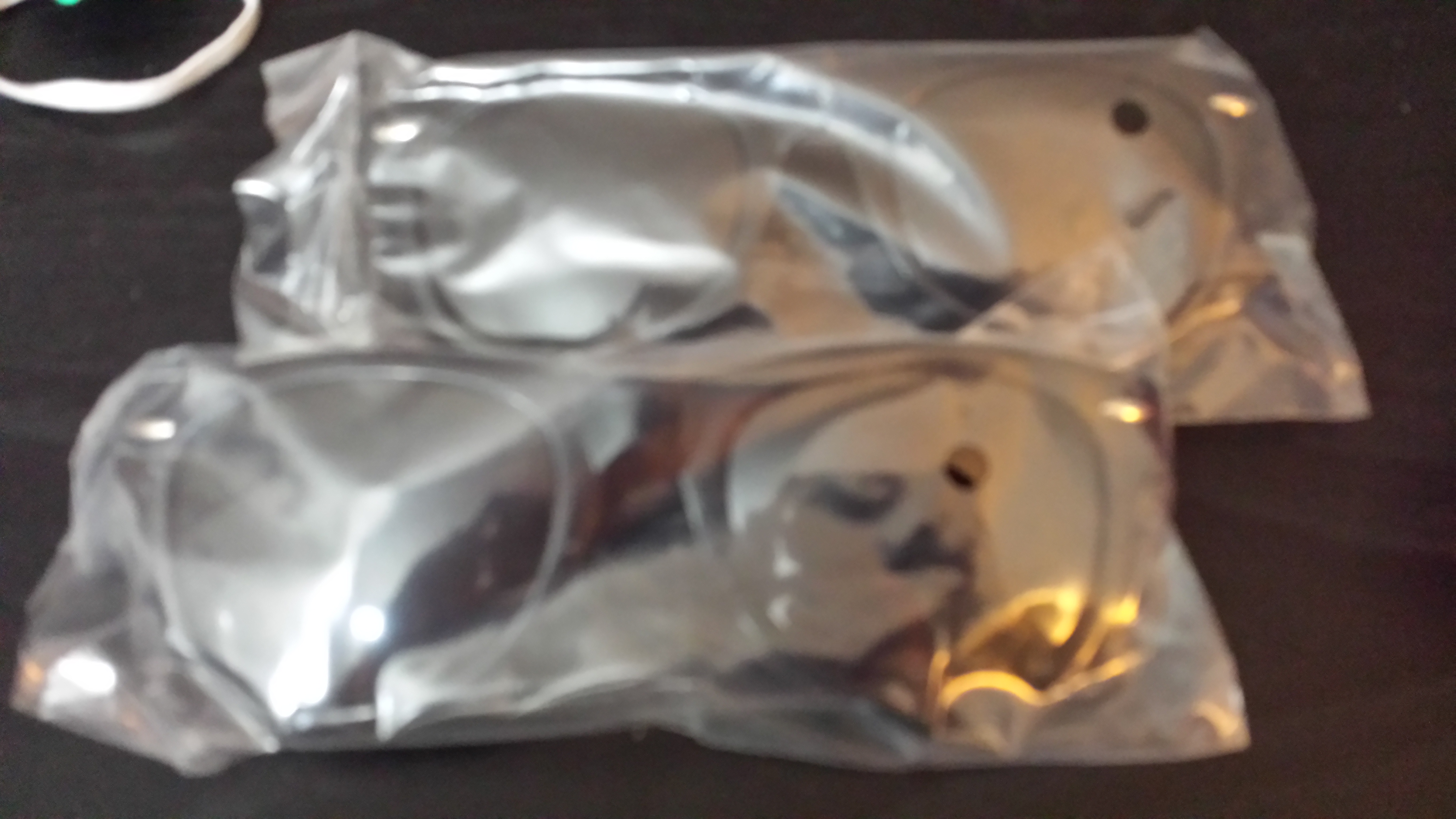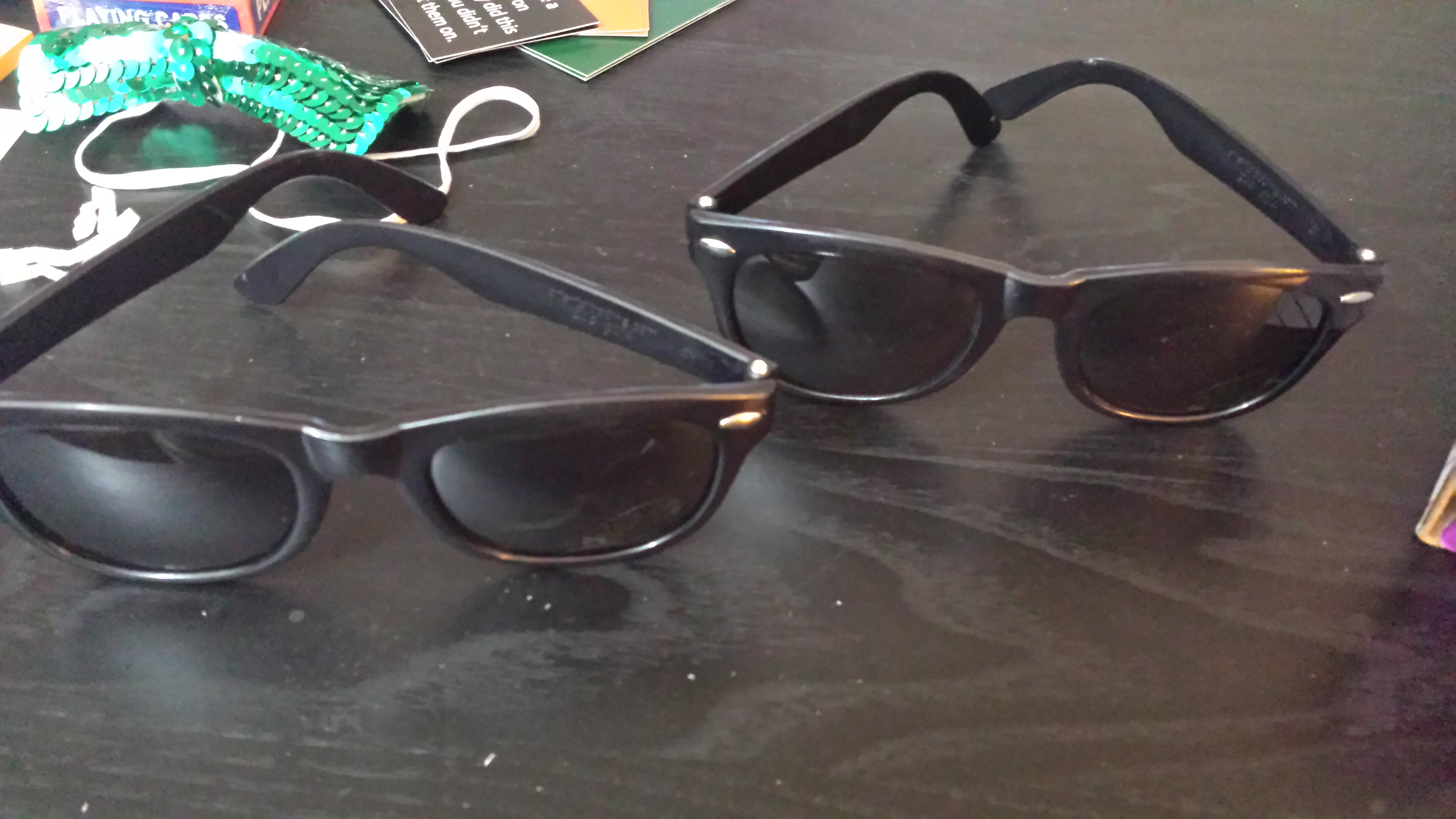 “Bluffing shades” sent in plastic wrap. We only used these for a few minutes. Now they are toys for the kids to play with.