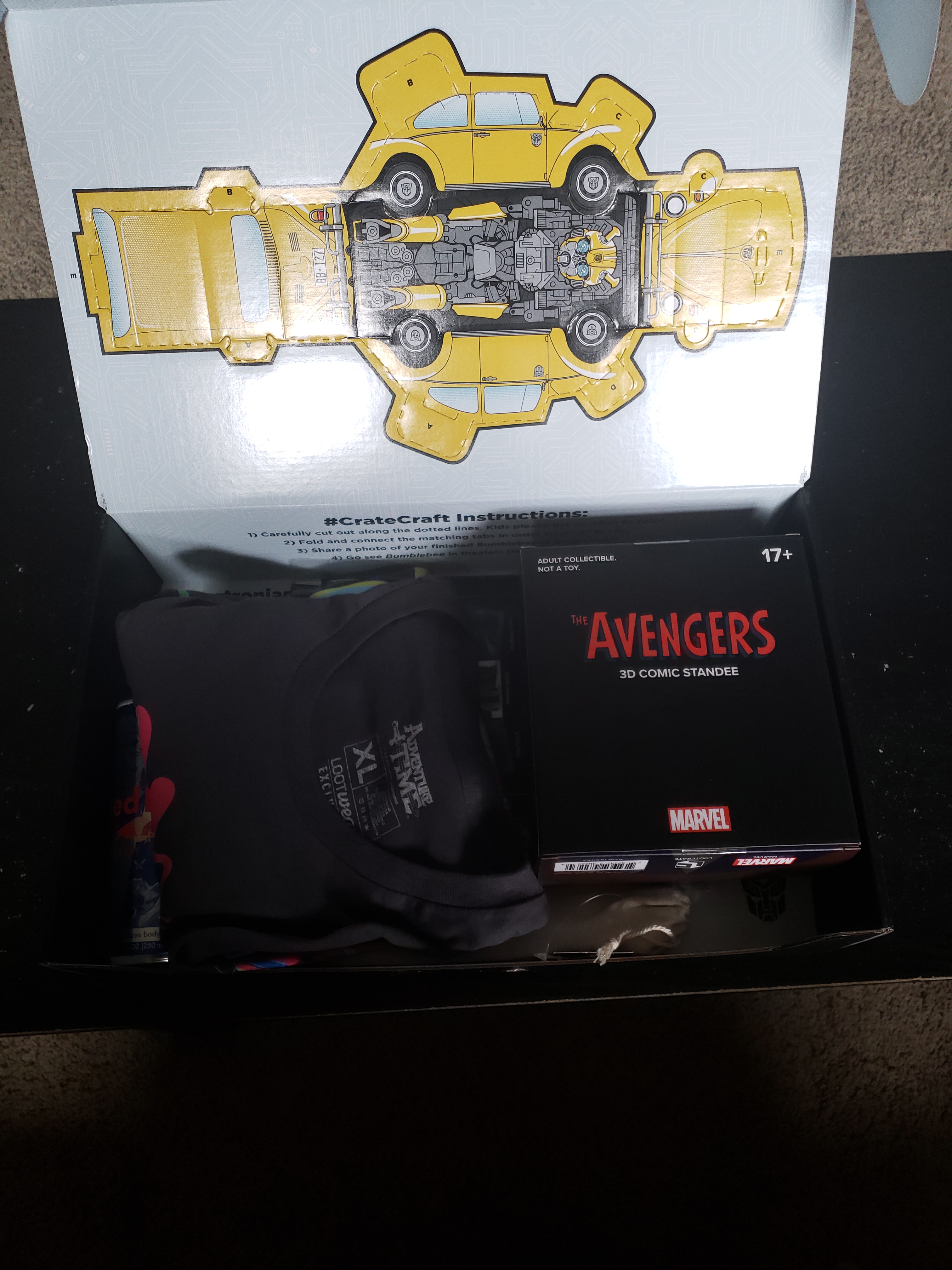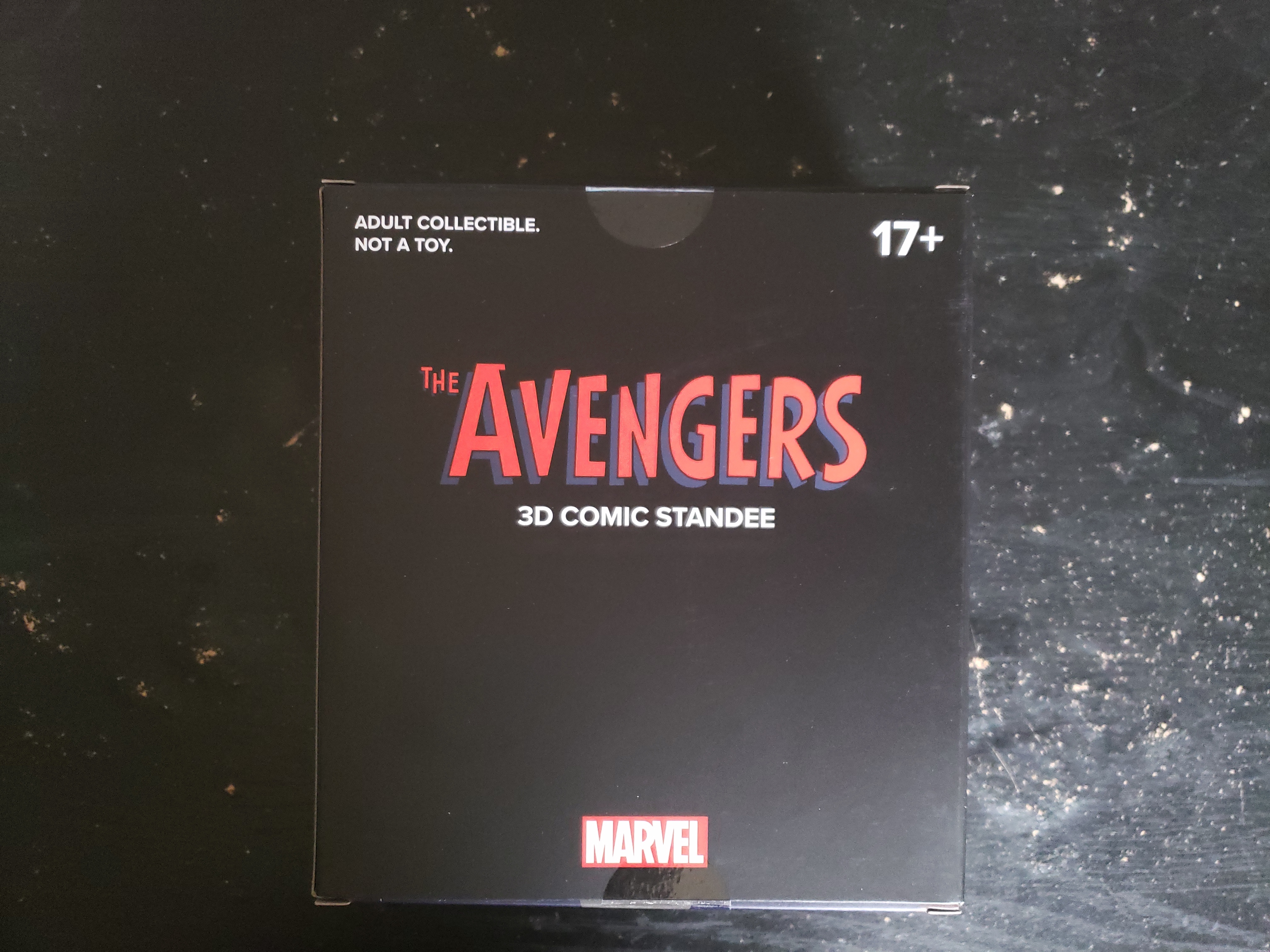 First up in our box, we have an ORIGINAL Avengers 3D Comic Standee. I’d set this value around $10. It comes in a plain black box with some fancy The Avengers logo work and the top part of what I assume is Caps shield on one side.