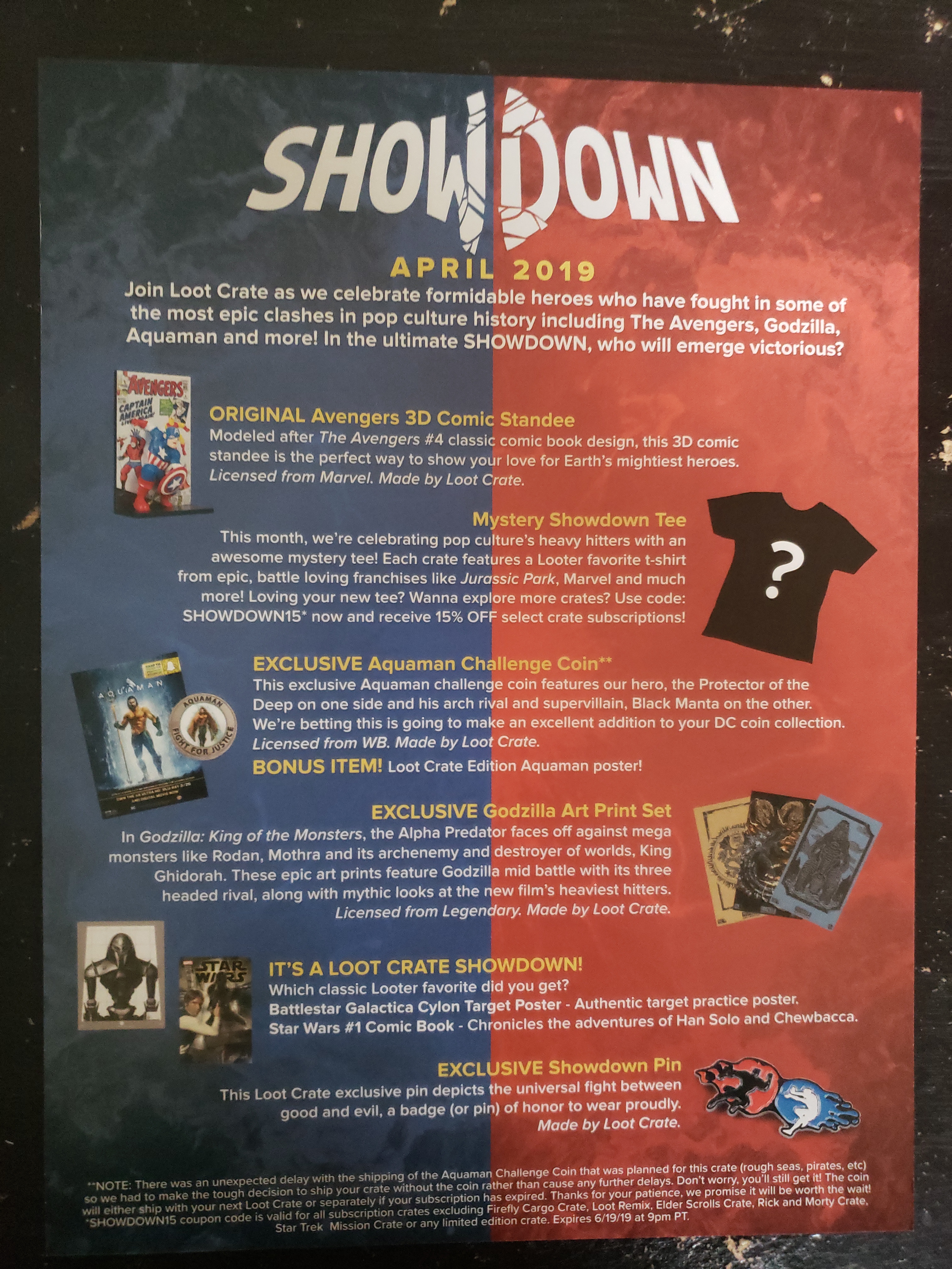 Hello there world, S (or Steve as I’m also called) here with my review for April 2019’s Loot Crate, themed showdown.