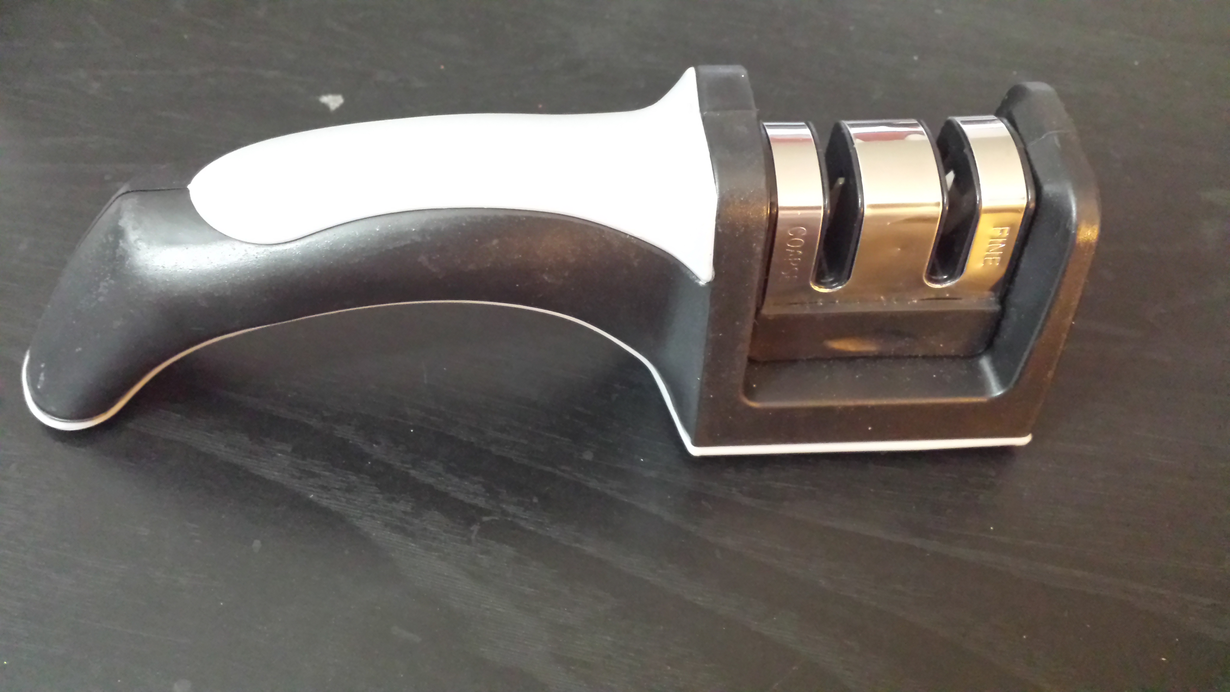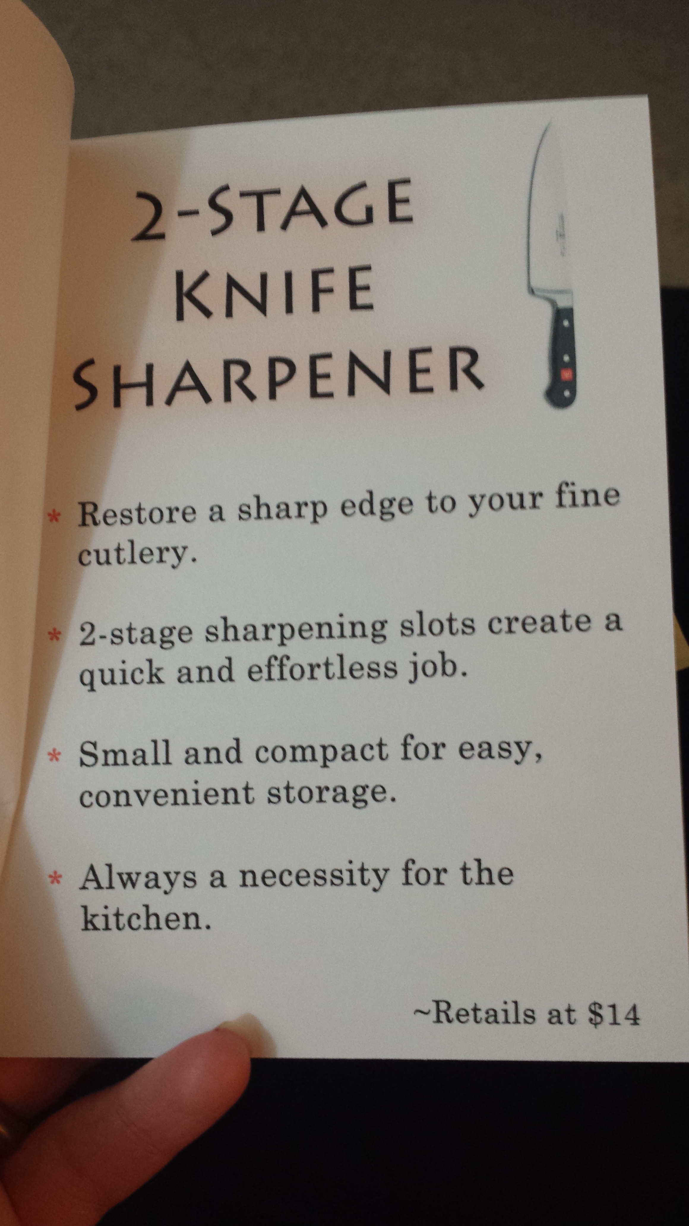 Knife sharpener. Did not come in a box, so I am not sure on brand. Danklo has it retailed for $14. I looked online and found it for no more than $8 on Ebay and that was including shipping.