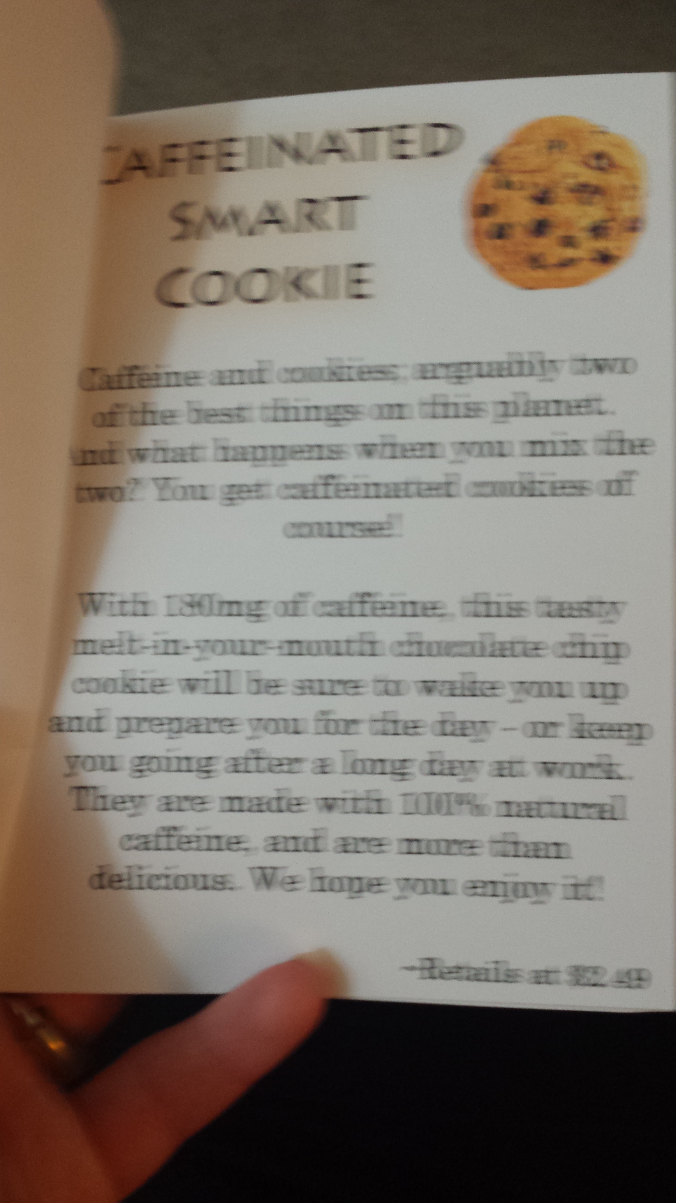 Get up & Go smart cookie. Caffeinated cookie. Danklo has them retailing for 2.49. I looked them up online. (They have a Facebook page, Get up and go caffeinated Baked goods) They sell these cookies at various gas stations in MI and IN for 1.99. No one in my house really cared for it. I`m a big sweets fan and I could not even finish it. I can’t even really describe the taste.