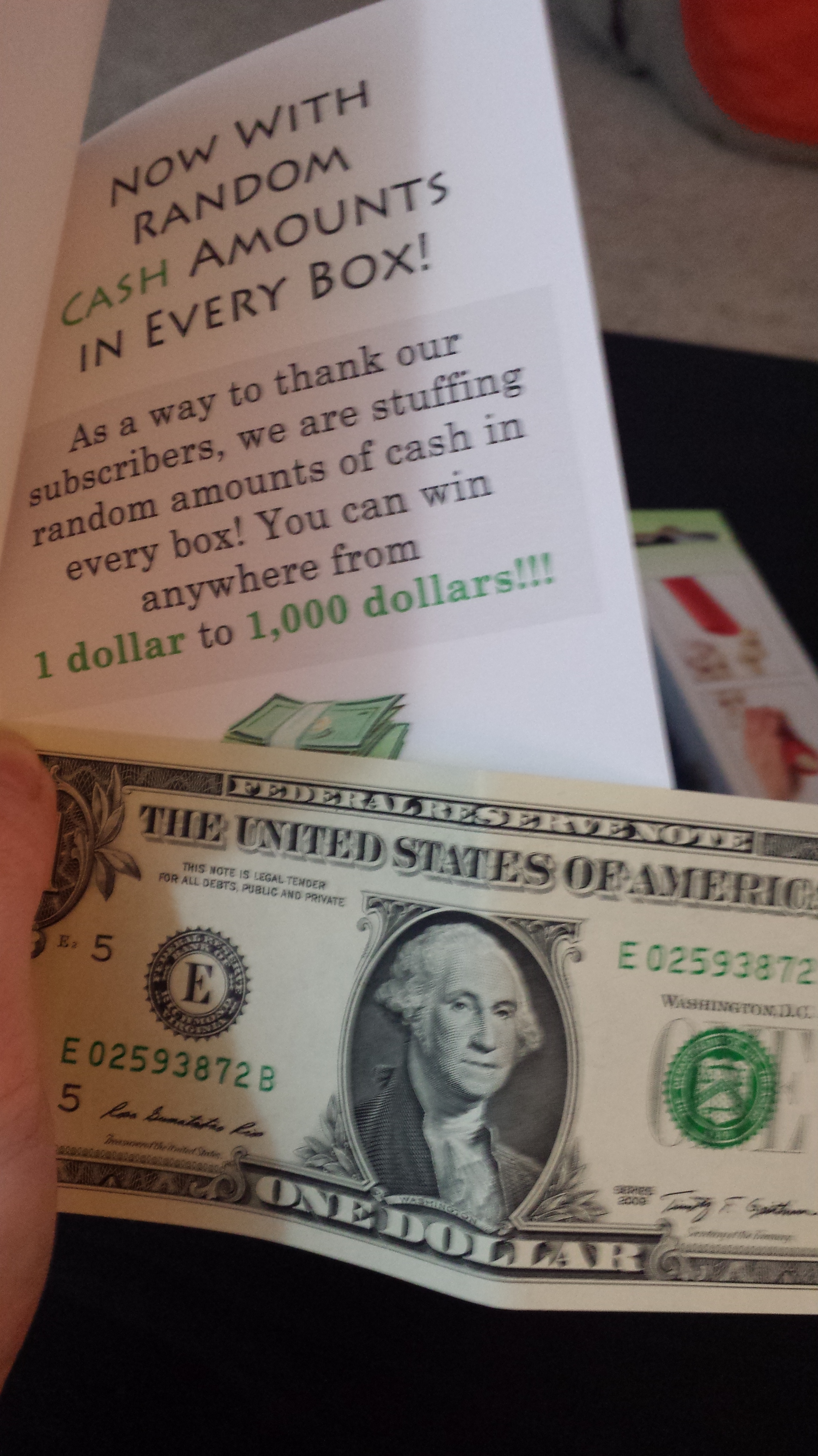 As with all Danklo boxes they include cash. Anywhere from $1-$1000. Nope still no grand for me. Just another dollar bill. Not likely anyone will get the thousand dollars, but who knows.