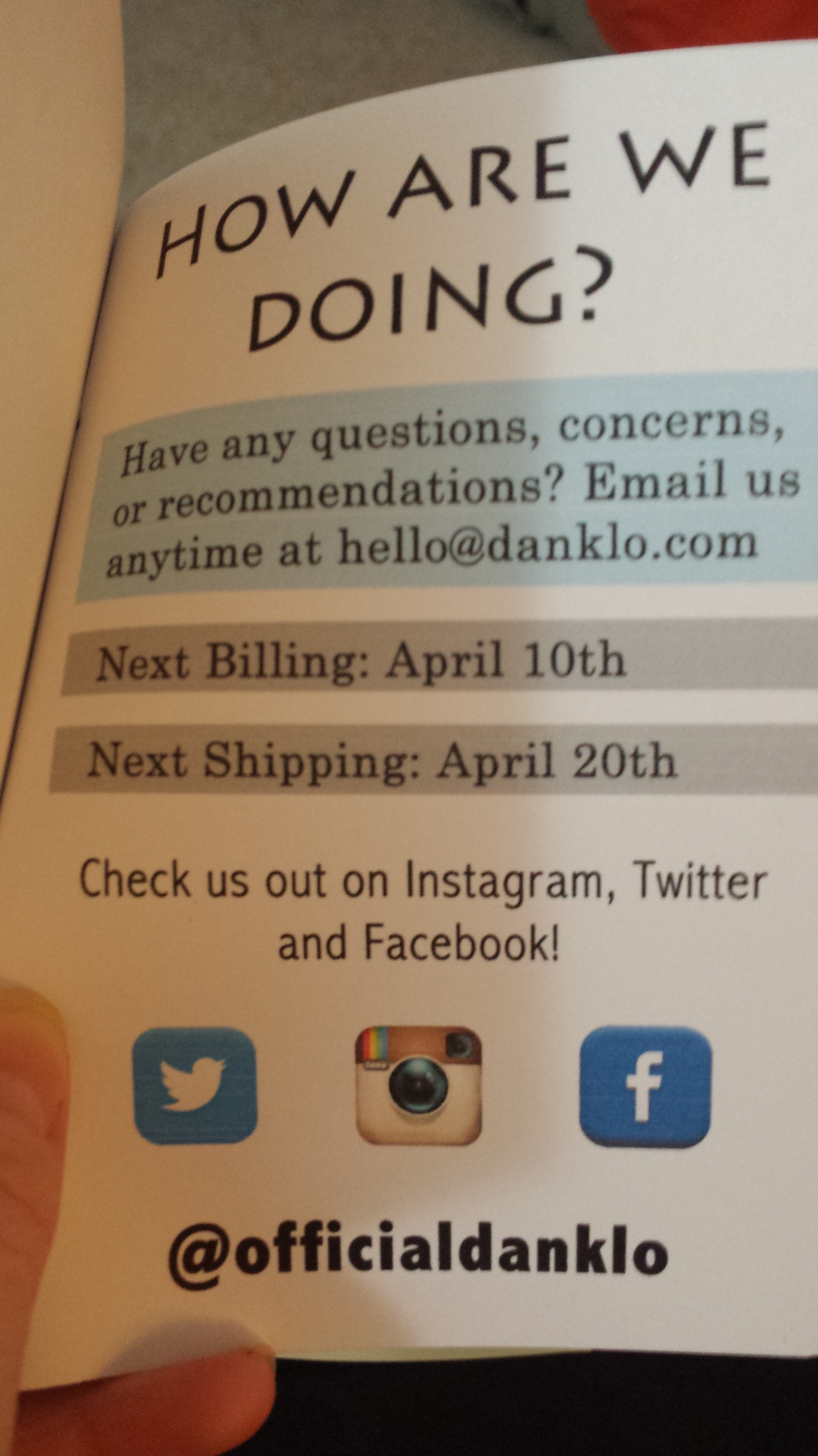 Second Danklo box I am receiving. Not too satisfied with Danklo box. I will no longer order them. I honestly do not feel like they are worth the money.