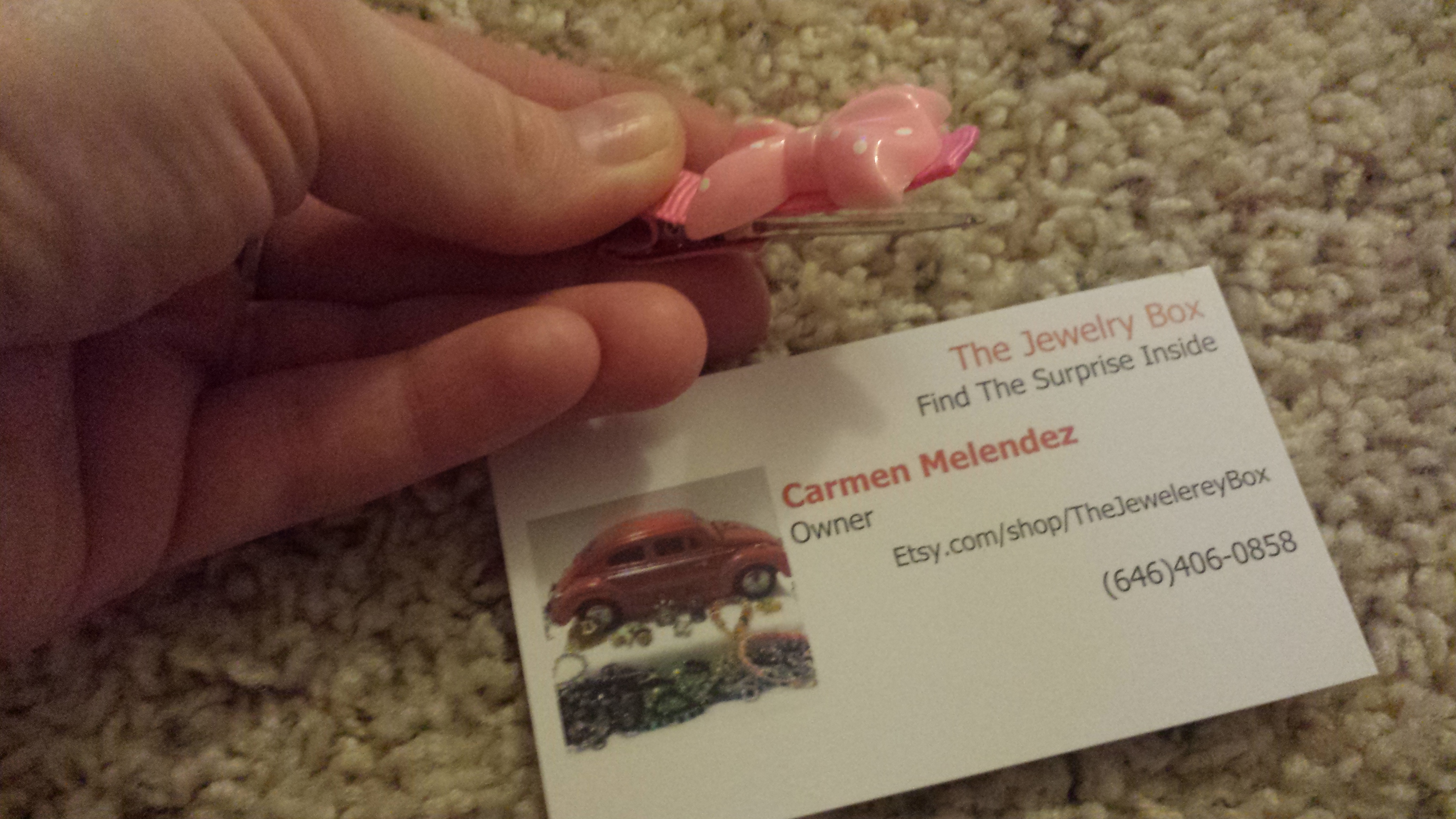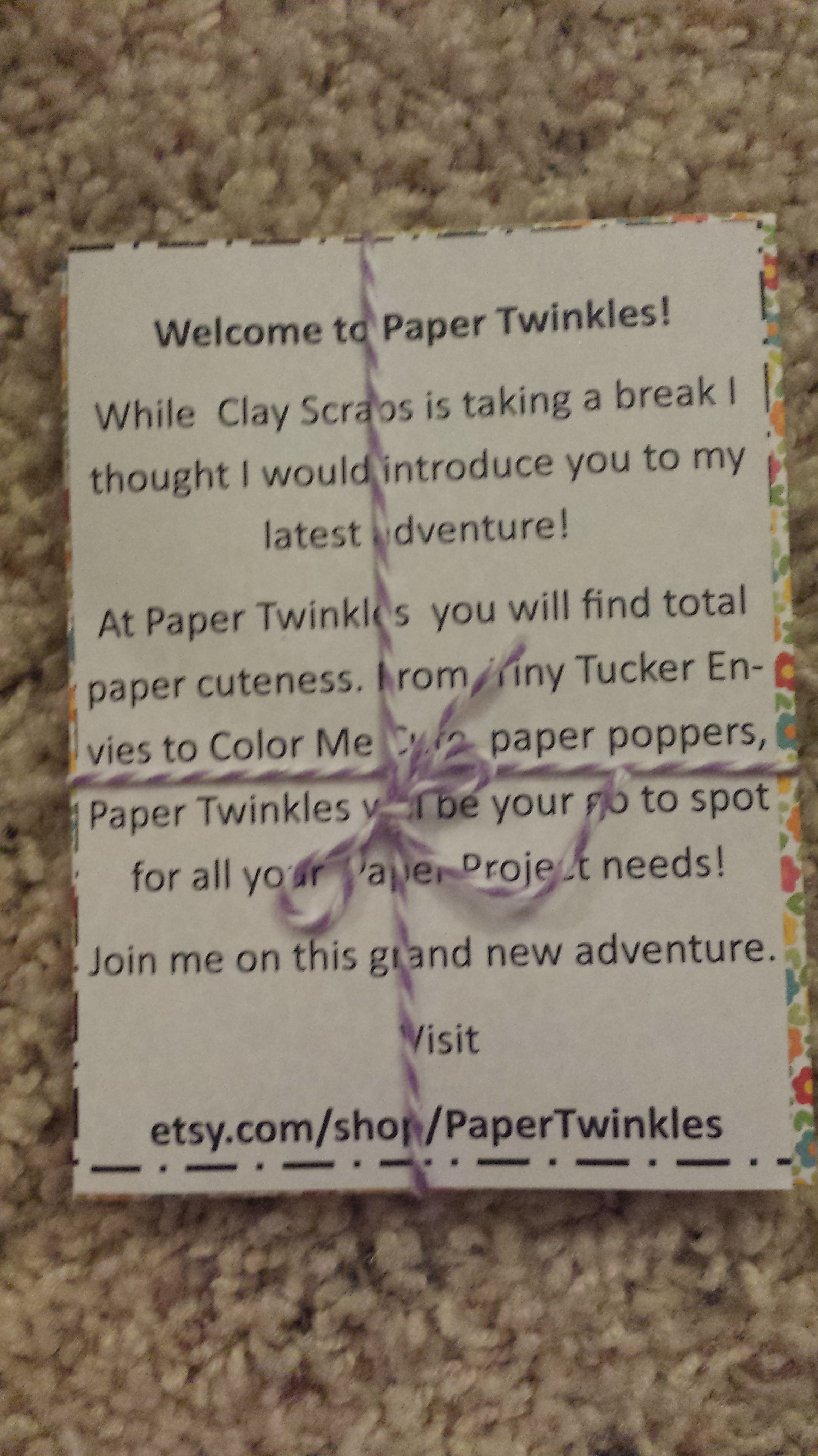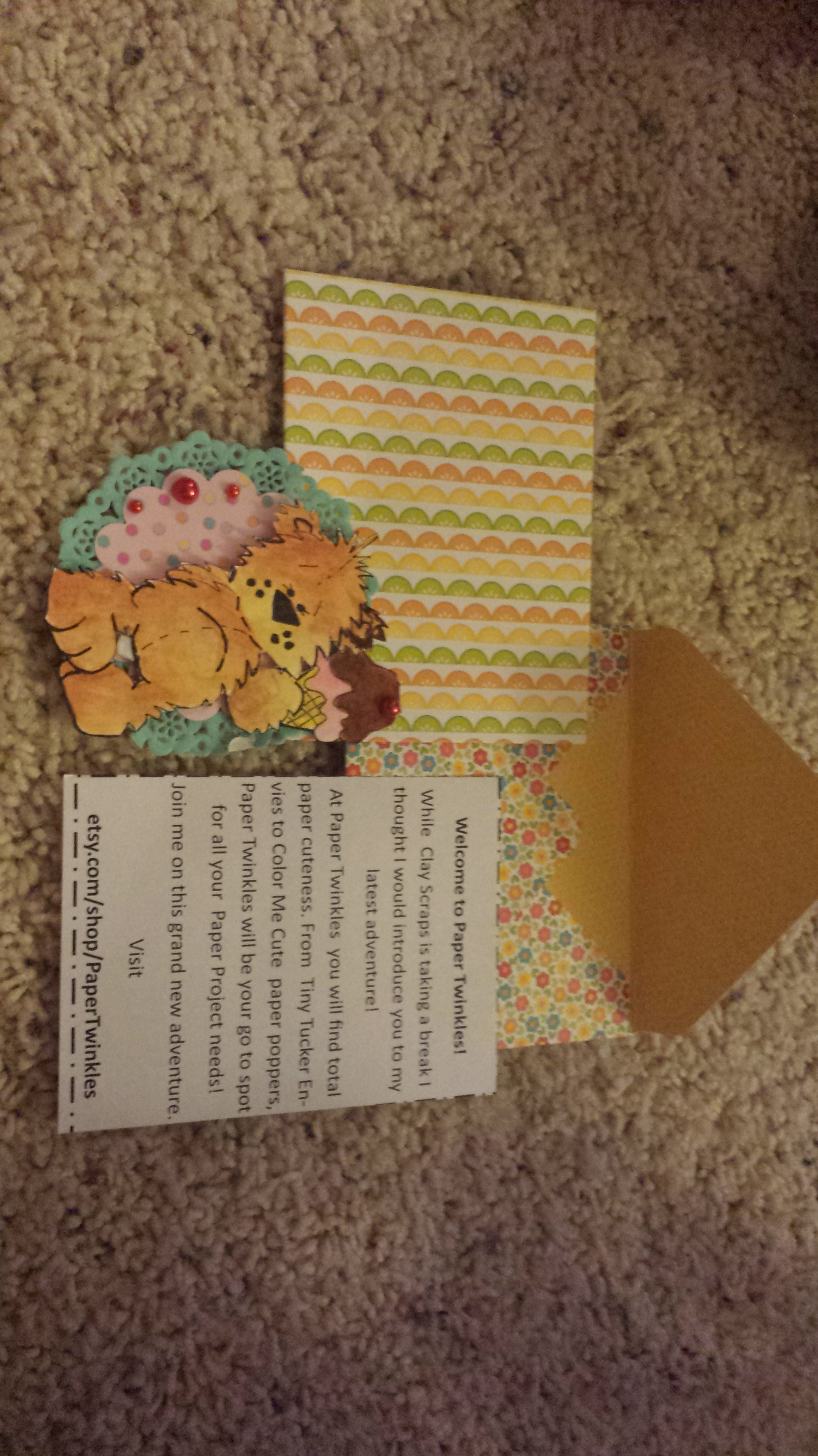 When writing this post I am just going to reach into the box and grab the first thing I touch. The first thing I grabbed was from Paper Twinkles. I am assuming the same person who does Paper Twinkles had a second site. The paper included with these envelopes mentions a Clay scraps site. I went to their etsy site to see what other items they sold but there is nothing on the site. If you are interested in looking for yourself, check it out here. I received two envelopes. They are small in size but very cute. Inside one of them is some sort of decoration?(see the first picture) There is a bear cutout attached to what seems to be similar to scrap booking paper. It is cute, however I really have no use for it. Maybe I will attach it to someones present in the future? As for the envelopes, you can’t really fit much in them. I will more than likely use them to gift money. They seem fairly sturdy.