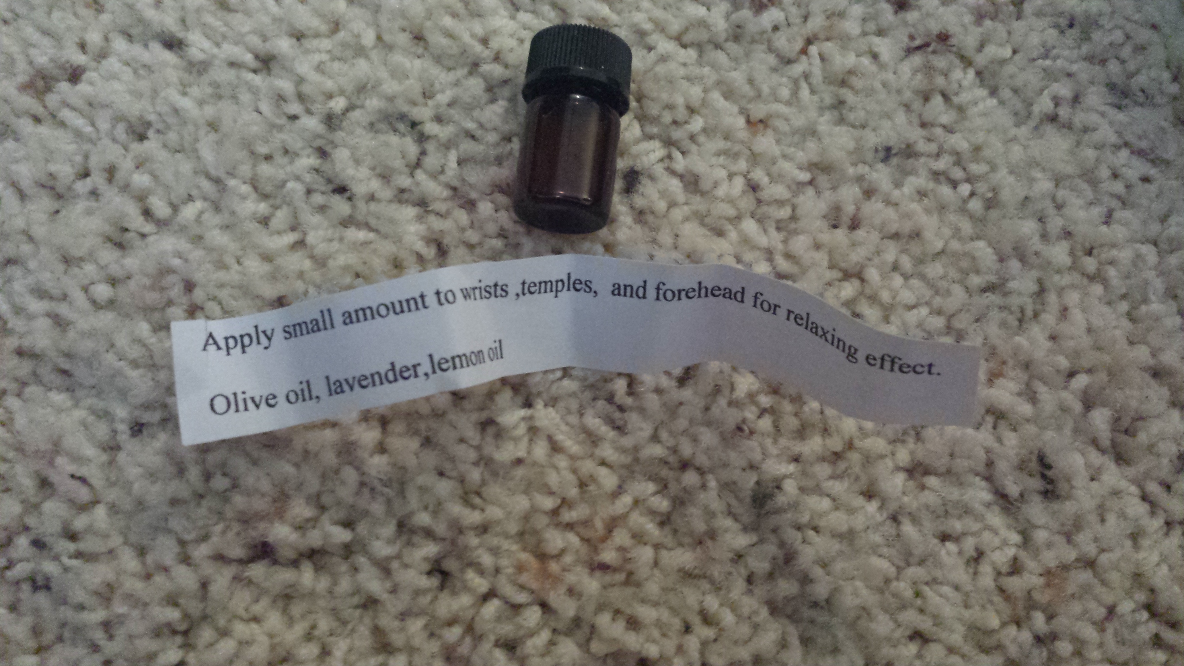 Relaxation oil. I have not tried this yet so I am not sure if it works. It has a very strong smell to it. I tried to find this one the site but found nothing. Not even anything similar. Check out http://mothersnaturestore.com
