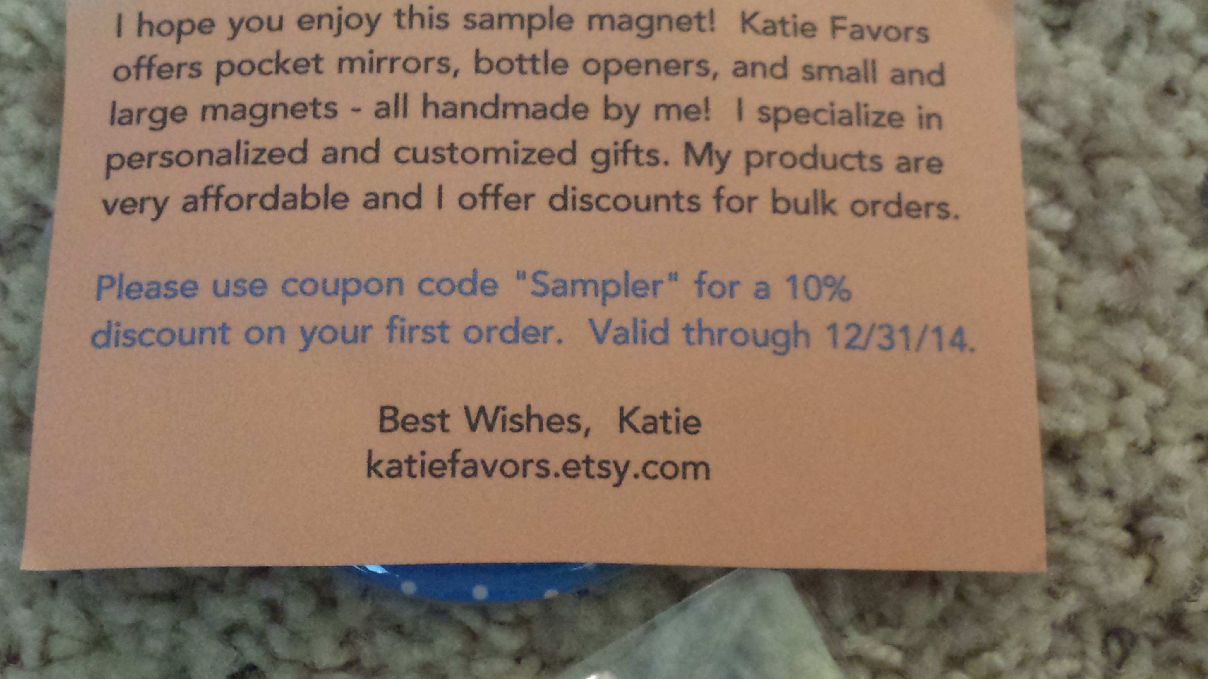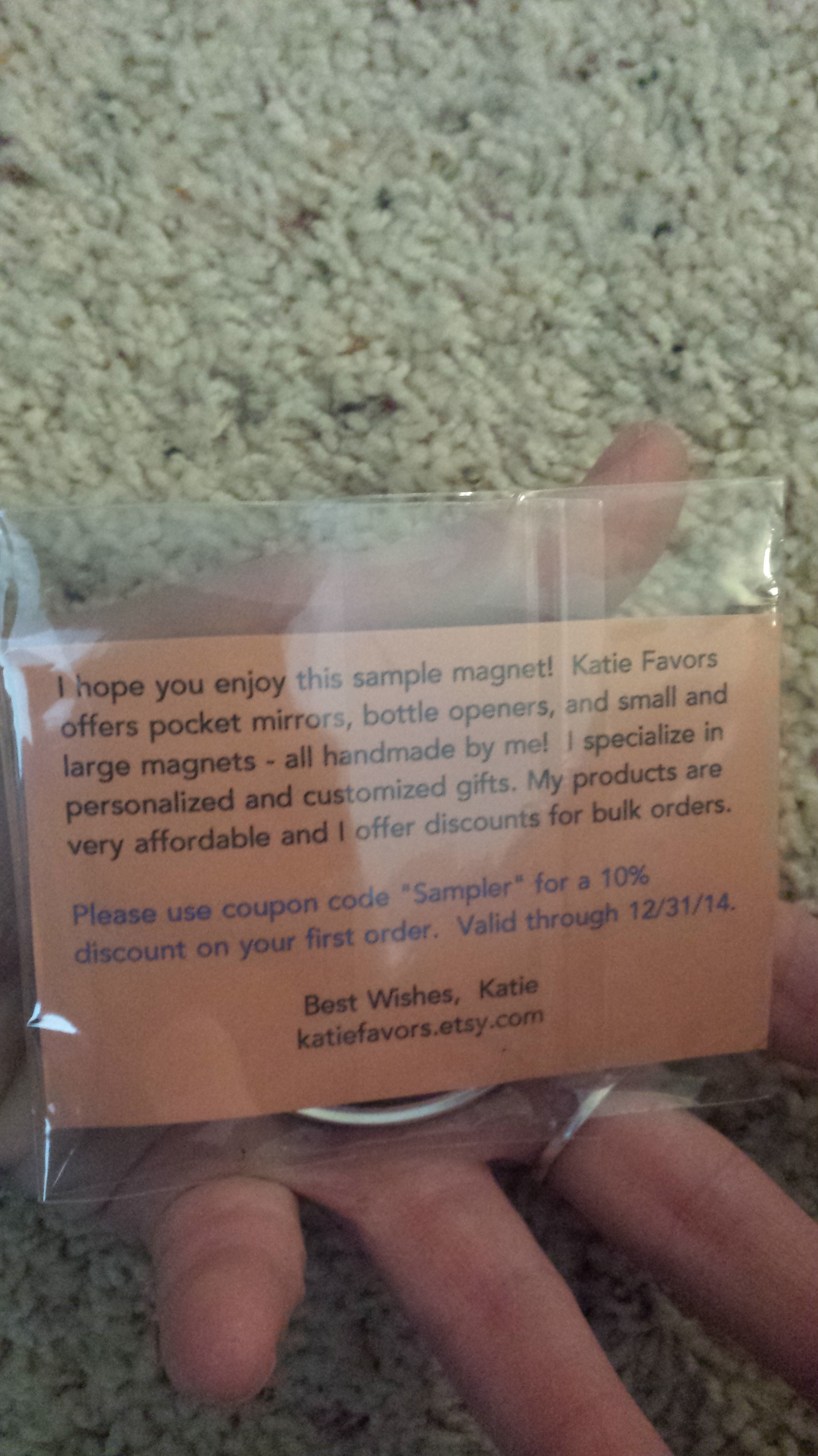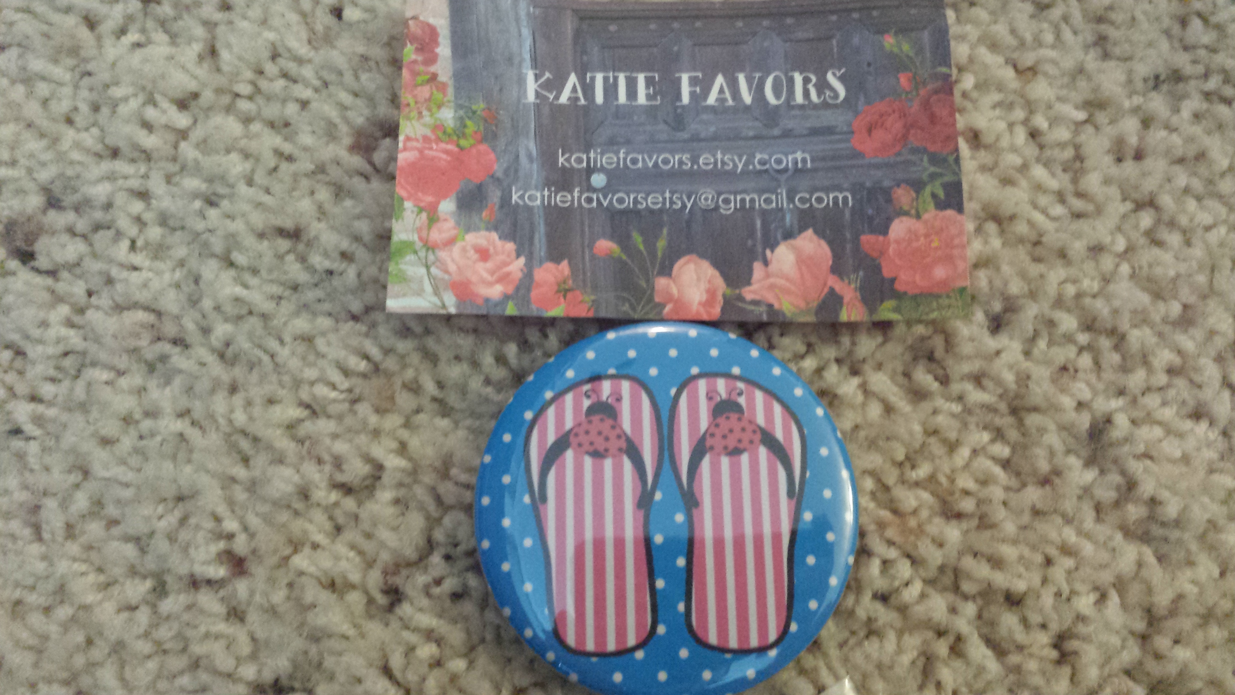 Lady bug flip-flop magnet. Super cute. Made by http://katiefavors.etsy.com. Her stuff is adorable. You can get a set of these magnets for $11.00. ( Pack of 16) The only thing I didn’t like about this was the sellers card. She offered 10% discount using coupon “Sampler” however, it expired 12/31/2014. May have been a misprint though.